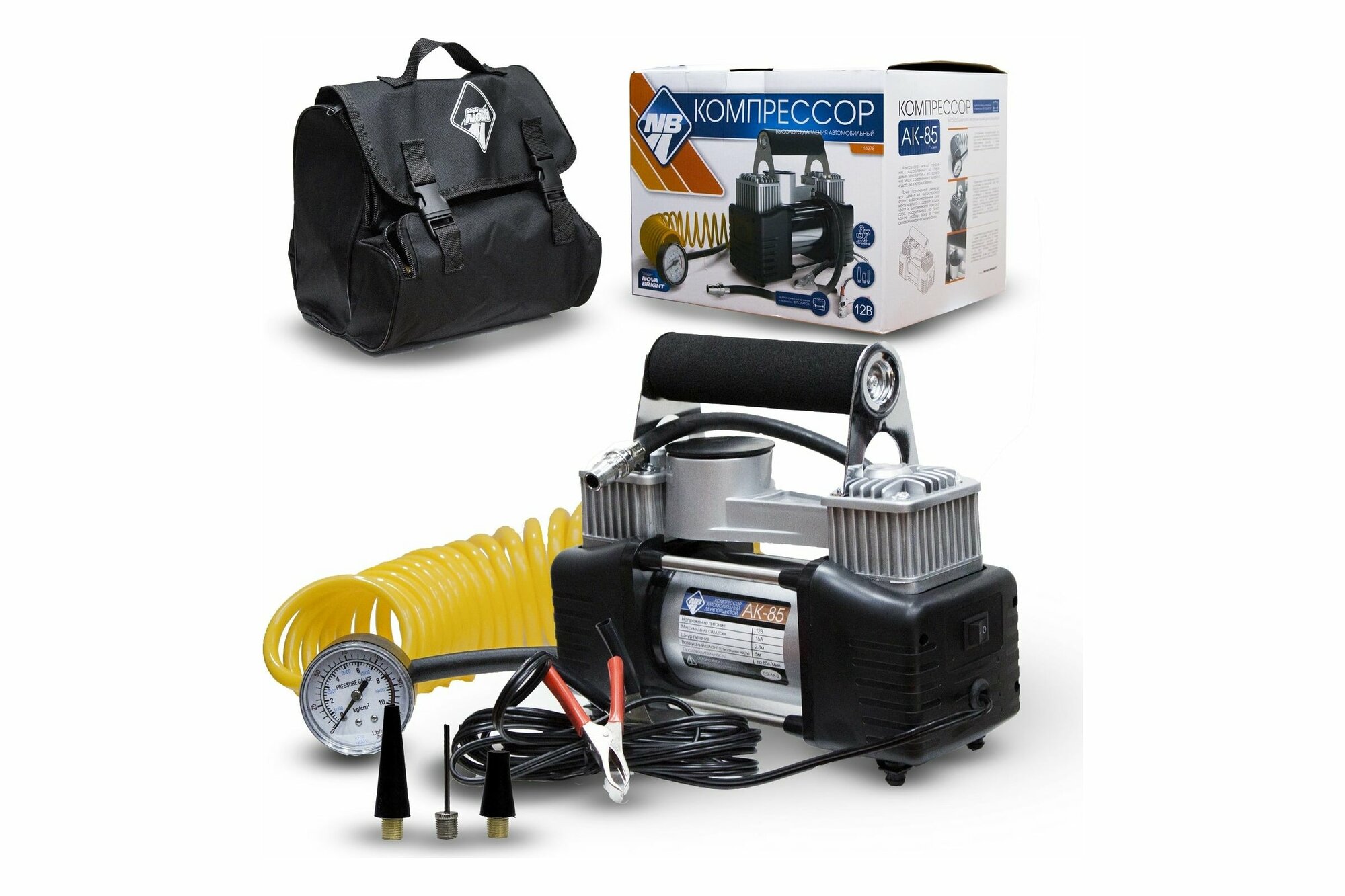 Компрессор (Nova Bright) АК-85 двухпоршневой, до 85 л/мин.,150 PSI, 12В, металл. корпус, в сумке