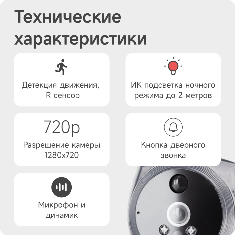 запись видео по датчику движения, оснащён ИК-подсветкой, поддержка карт памяти microSD емкостью до 32 Гб, функция автоматического отключения дисплея, возможность записи фото вручную , универсальный крепеж для разных дверей толщиной от 35 до 115 мм