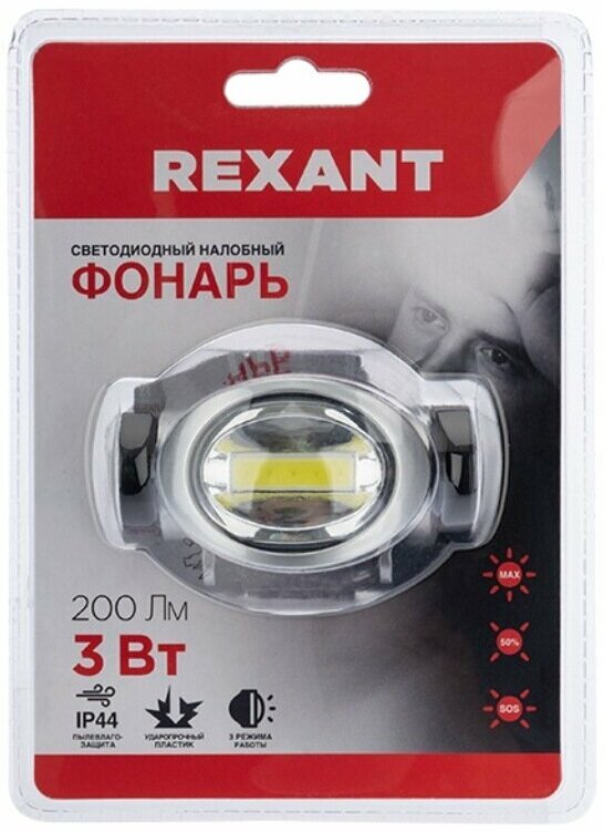 Фонарь налобный светодиодный Rexant, поворотный СОВ, рассеиватель, 3 Вт