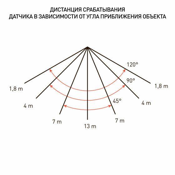 Фактически на максимальных настройках: - по прямой срабатывает на 6 метрах. - сбоку 1.5-2 метра - угол охвата ~ 120 |