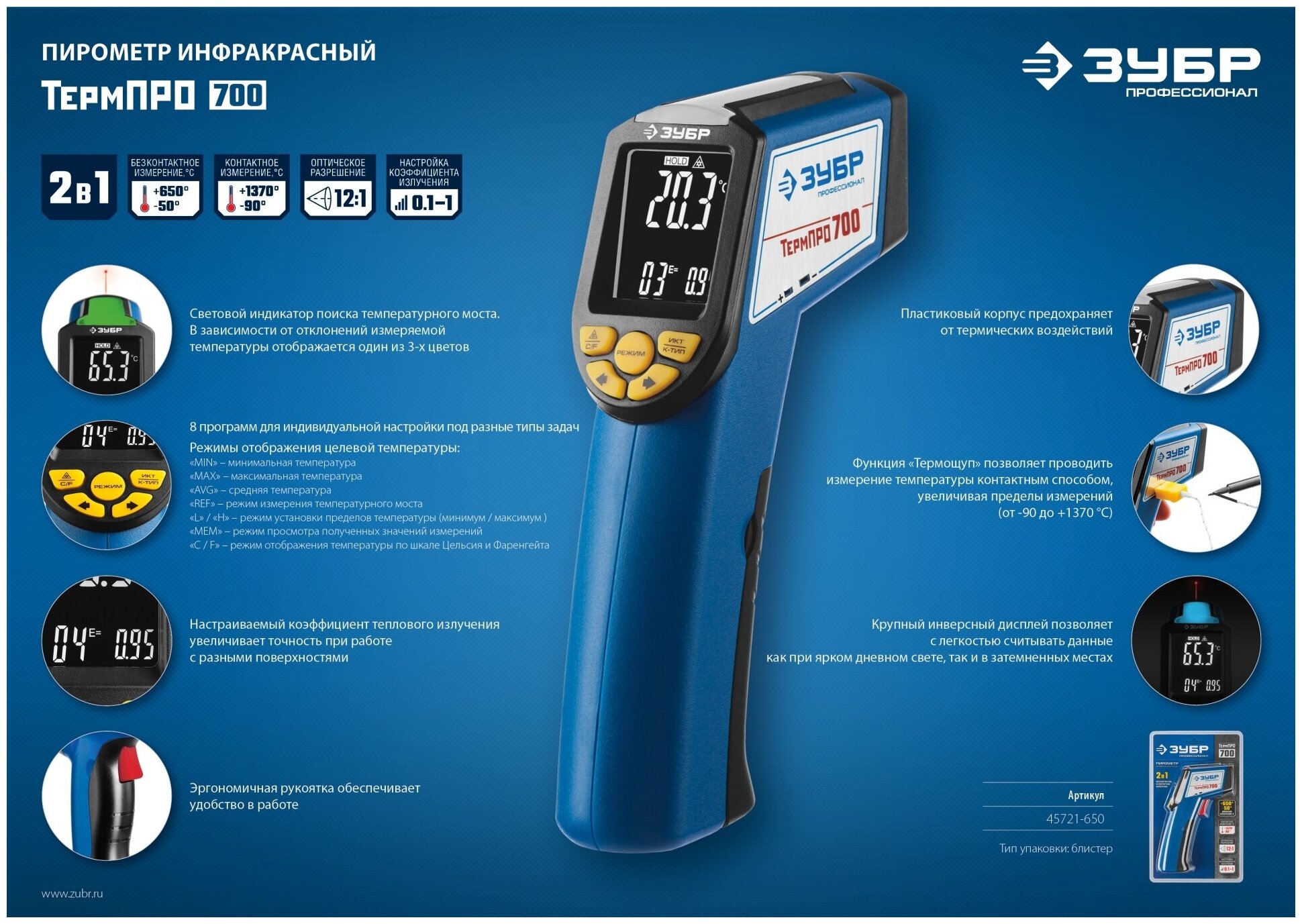 ЗУБР Пирометр инфракрасный, -50°С +650°С, ТермПро-700, ЗУБР Профессионал, ( 45721-650 )