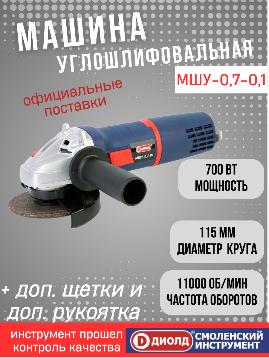" Машина шлифовальная угловаяДиолд" МШУ-07-01,( болгарка, УШМ ) 700 Вт, двигатель коллекторный, 11000об/мин, производитель россия