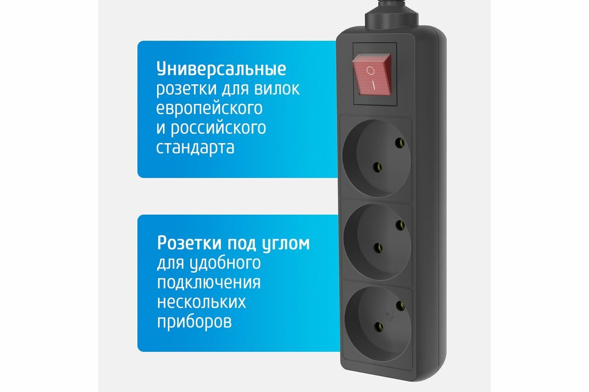 Удлинитель сетевой для розетки фотон 10А 3 метра 3 розетки с выключателем черный, ГОСТ