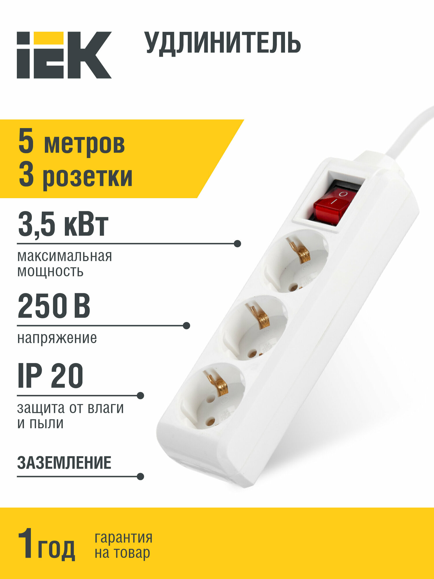 Удлинитель с выключателем IEK У05К-выкл, ПВС 3 x 1 мм², с заземлением, 5 розеток, 3 м, белый