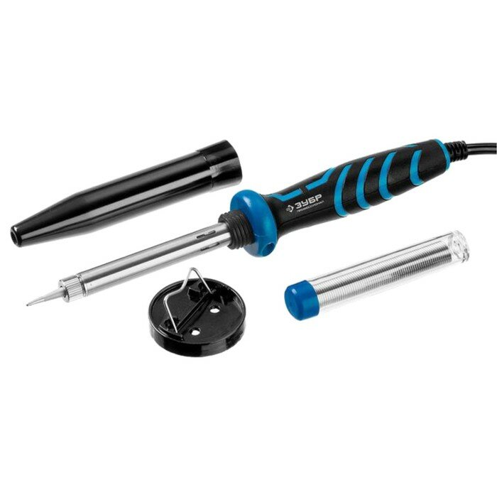 Паяльник ЗУБР "Профессионал" 55402-40_z01 с двухкомпонентной рукояткой и защитным колпачком в наборе с припоем и подставкой, 40Вт, конус