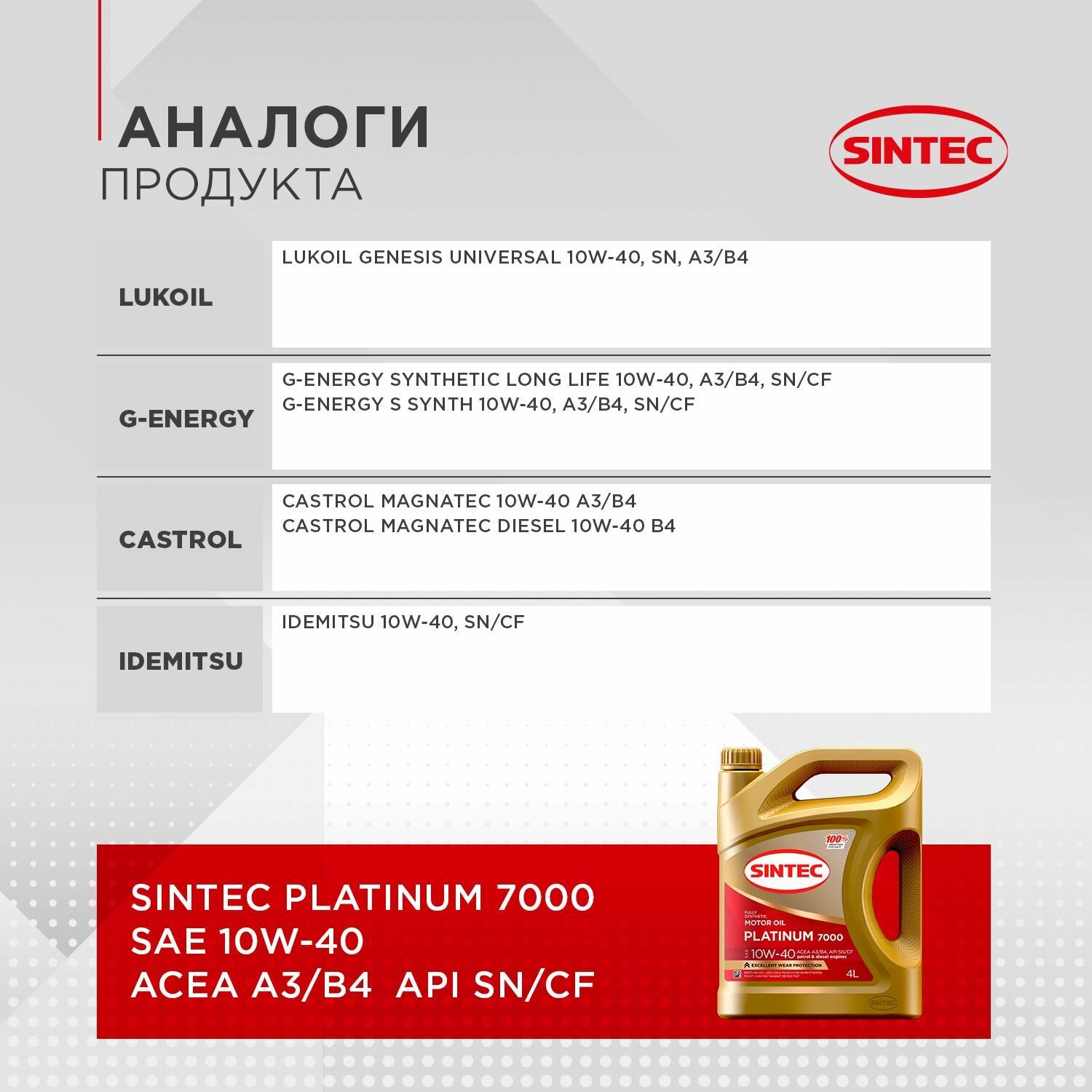 Sintec : 600166 PLATINUM 7000 SAE 10W40 API SN/CF A3/B4 1л