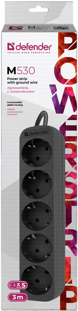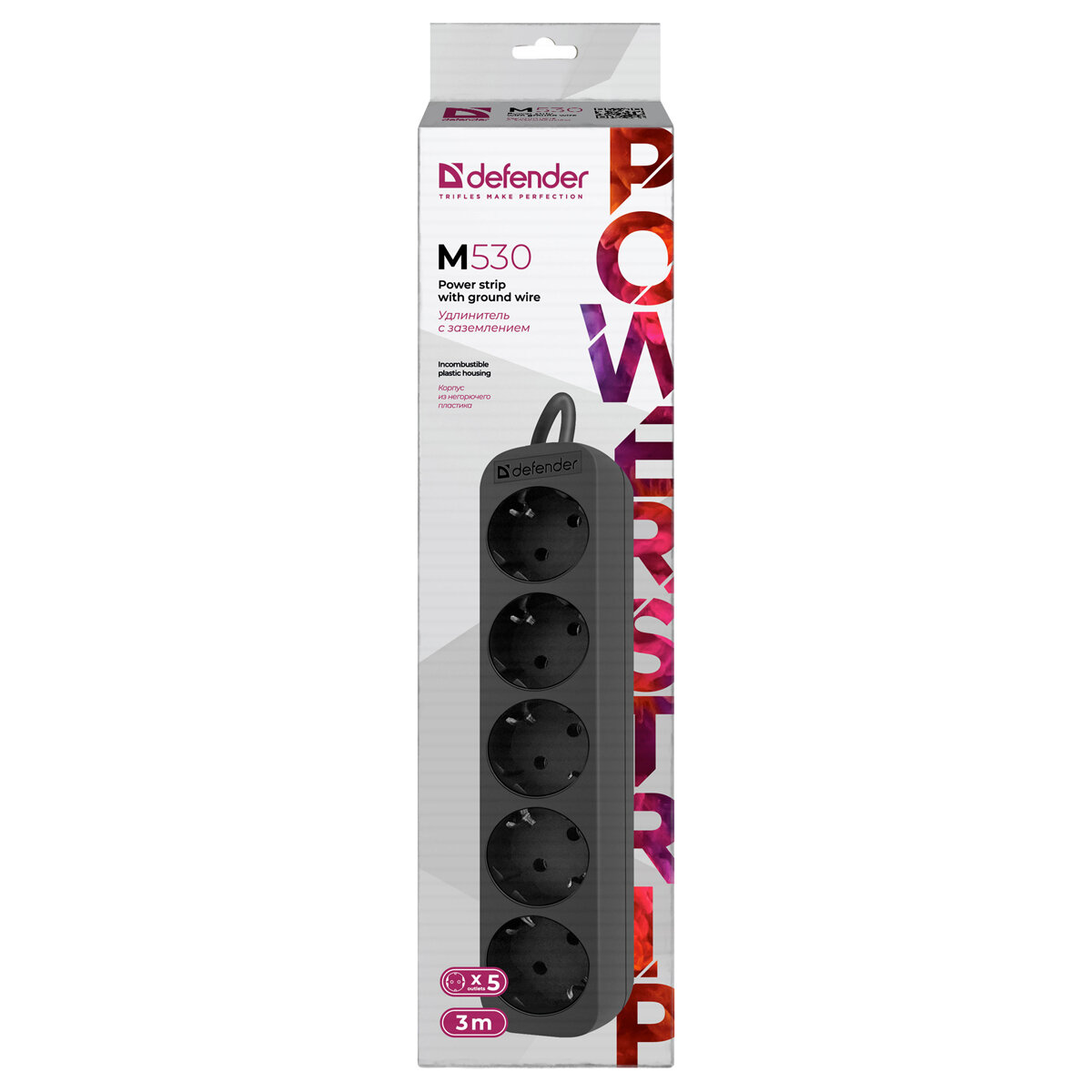 Удлинитель Defender M530, 5 розеток, с заземлением, 3м, черный (арт. 367823)