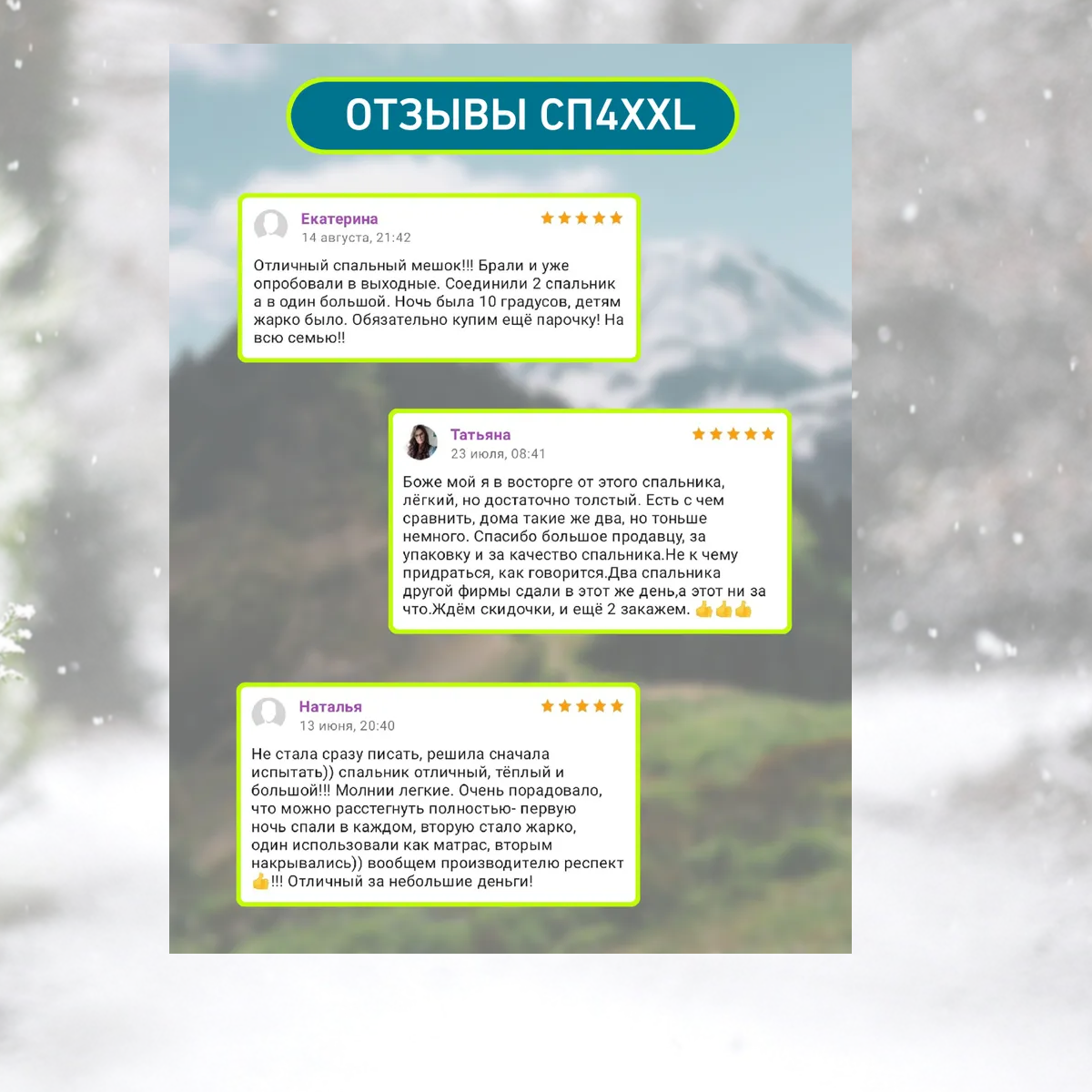 | Отзыв: | Неплохой спальник, теплый. Очень уютный. Ткань приятная. Хотелось бы чехол для спальника не такой тесный и отсутствие этого бесячего стыка на ткани... Оставила, так как некогда покупать другой, но ощущение от покупки подпорчено. Вообще для меня это брак. Может, это только мне так не повезло, а всем остальным отправляют приличные спальники. |