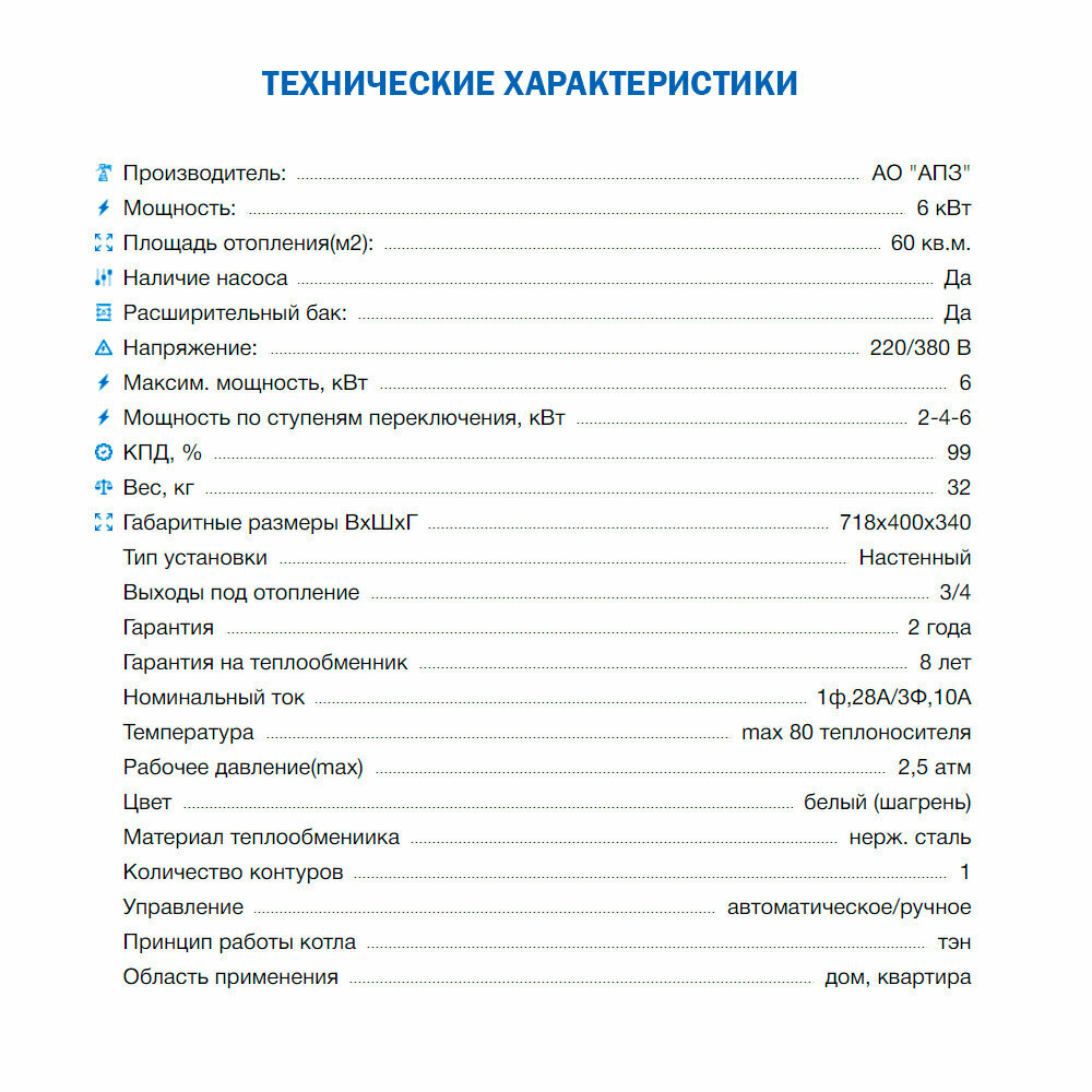 | Тепловая мощность | 2 - 6 кВт |