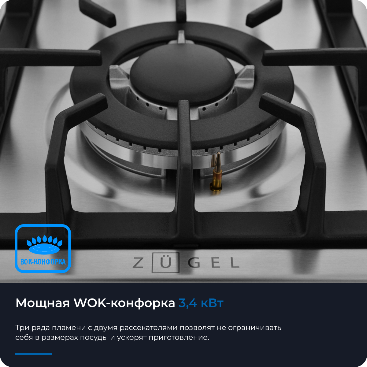Варочная панель газовая ZUGEL ZGH601X, 60 см, газ-контроль, 8000 Вт, WOK-конфорка