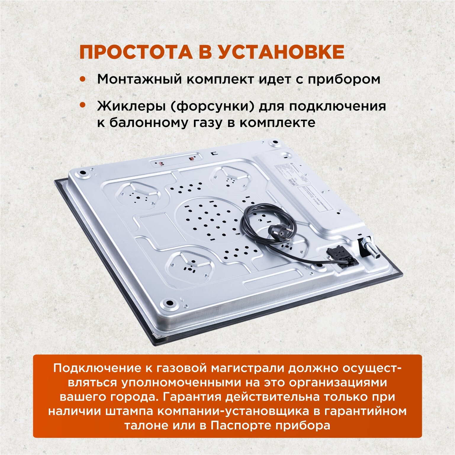 | Дополнительная информация | использование природного или сжиженного газа, штуцер для подключения баллона, жиклеры для сжиженного газа |