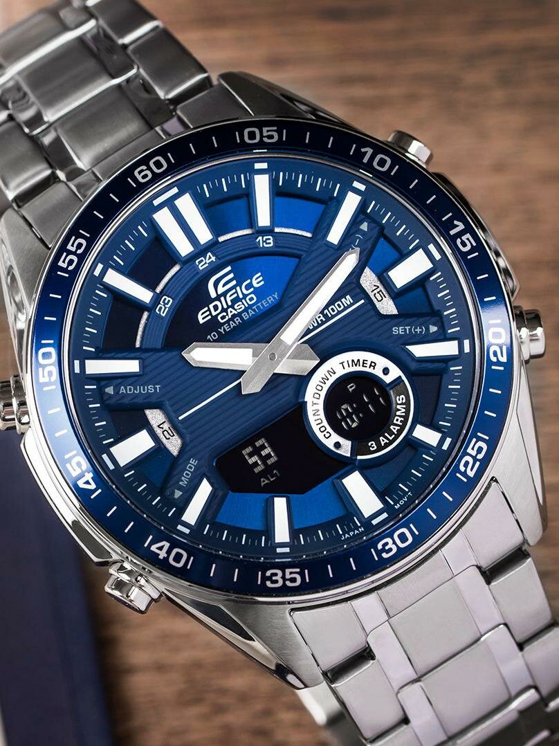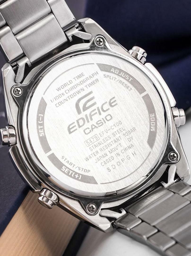 Наручные часы CASIO Edifice EFV-C100D-2A кварцевые, будильник, записная книжка, хронограф, секундомер, таймер обратного отсчета, водонепроницаемые, подсветка стрелок, подсветка дисплея, синий/серебристый