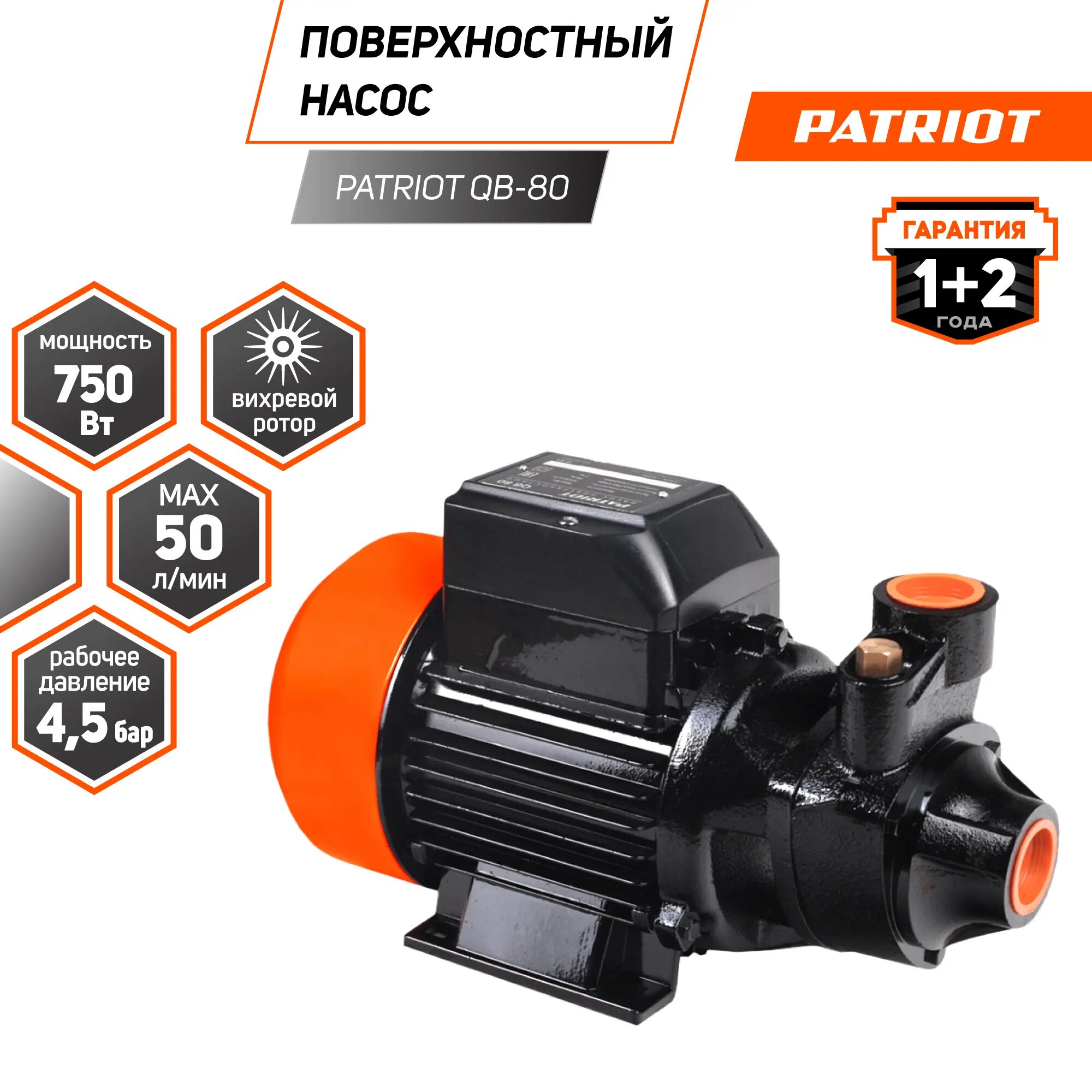 Насос вихревой поверхностный Patriot Qb-80, 750 Вт, 3000л/час, подъем - 45 метров .