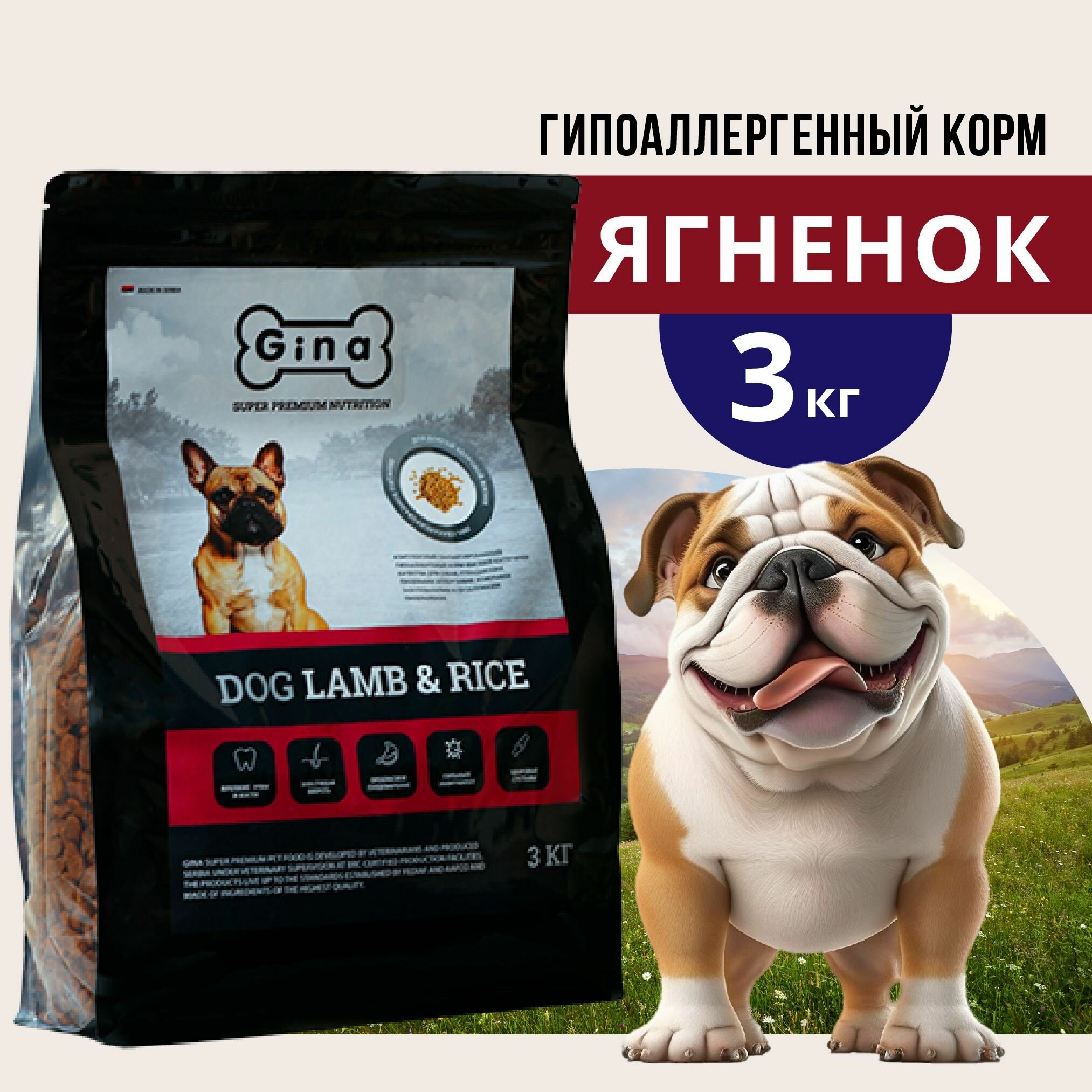 Сухой корм GINA DOG LAMB & RICE для взрослых собак с чувствительным пищеварением с ягненком и рисом, 3 кг