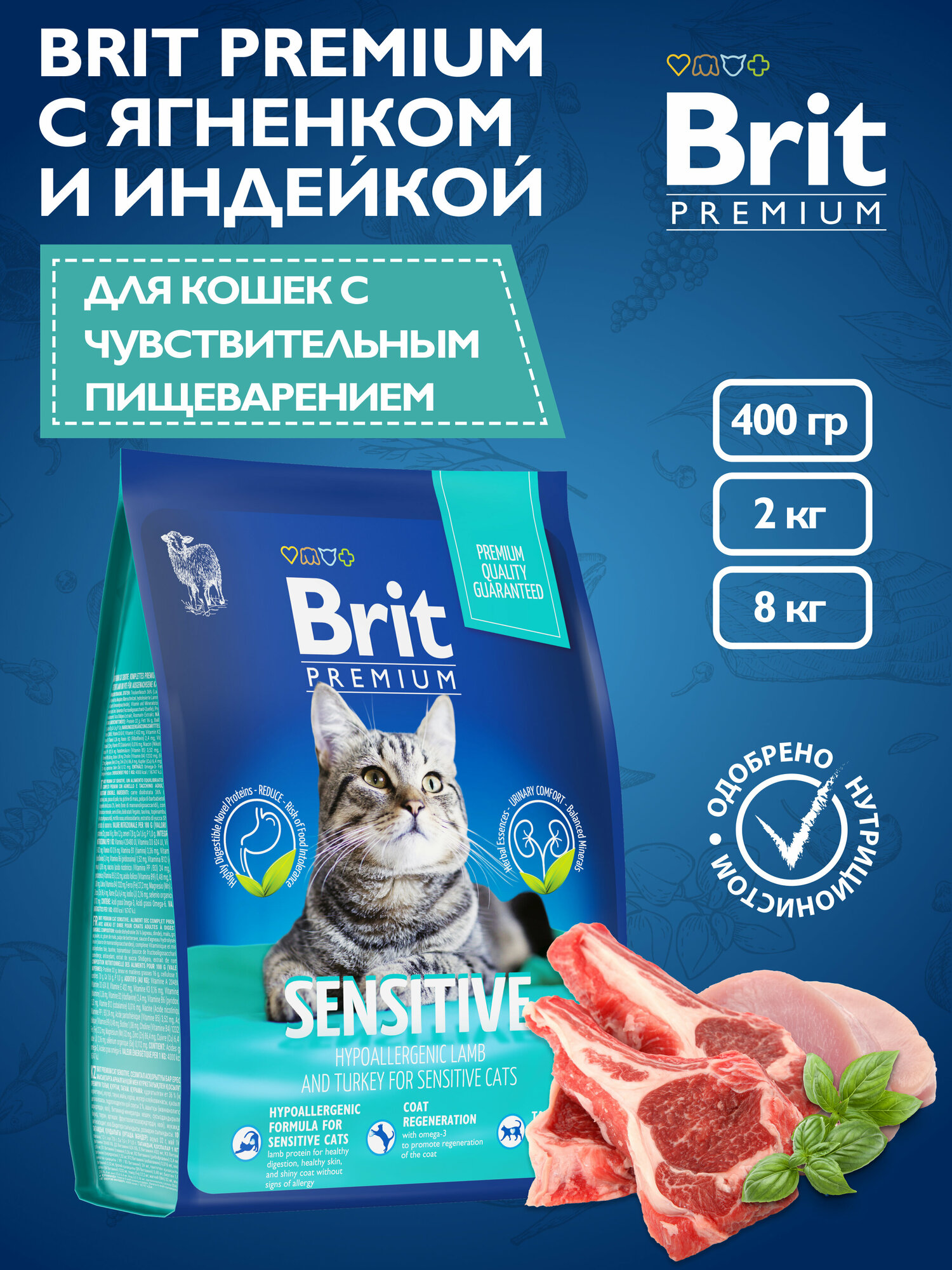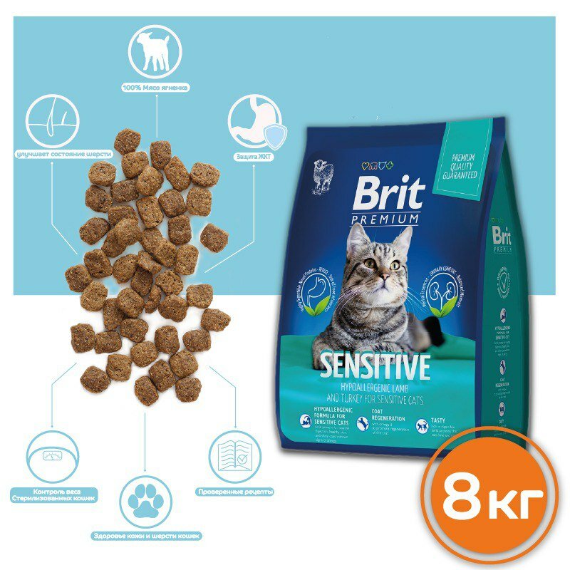 Корм Brit Premium Cat Sensitive для взрослых кошек с чувствительным пищеварением, с ягненком и индейкой 8 кг
