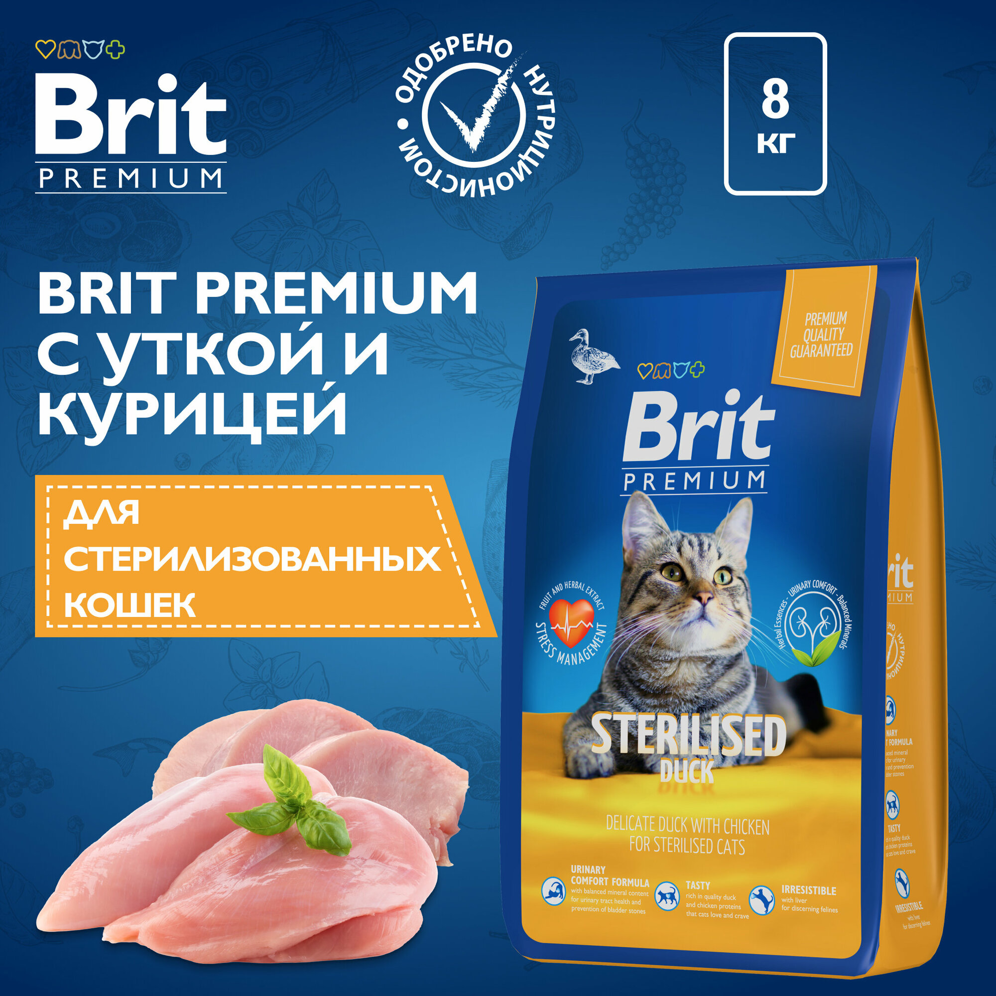 Brit Premium корм для взрослых стерилизованных кошек, с уткой и курицей 8 кг