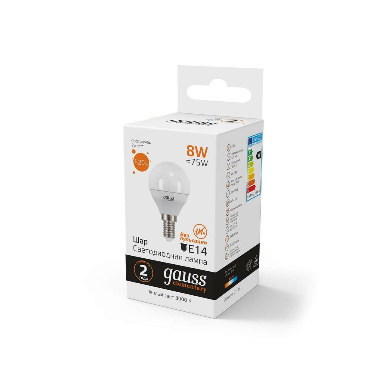 (2 шт)Лампа Gauss Elementary Шар 8W 520lm 3000K Е14 LED 1/10/100