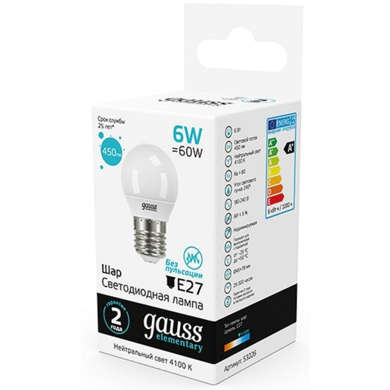 Лампа светодиодная Elementary 6Вт шар 4100К бел. E27 450лм 180-240В, GAUSS 53226 (1 шт.)