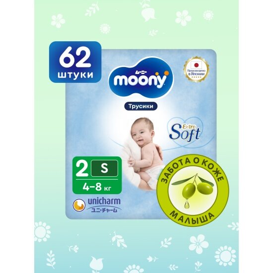 Подгузники трусики детские Moony Extra Soft универсальные 2 S 4-8 кг, 62 шт