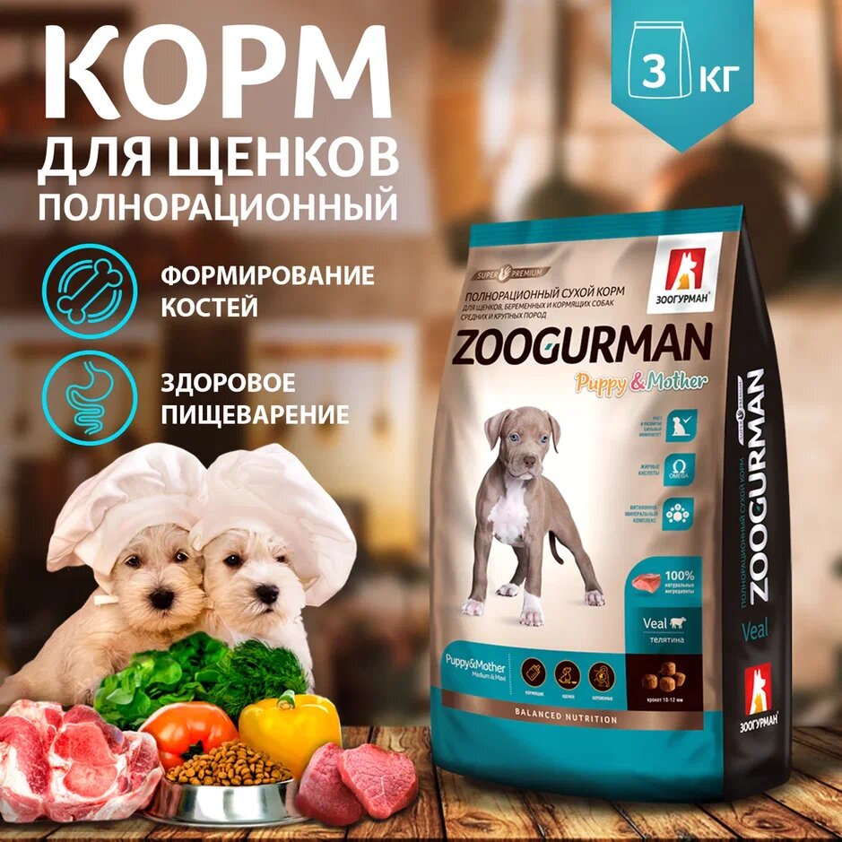 Корм для щенков, беременных и кормящих собак зоогурман для средних и крупных пород, телятина сух.3кг