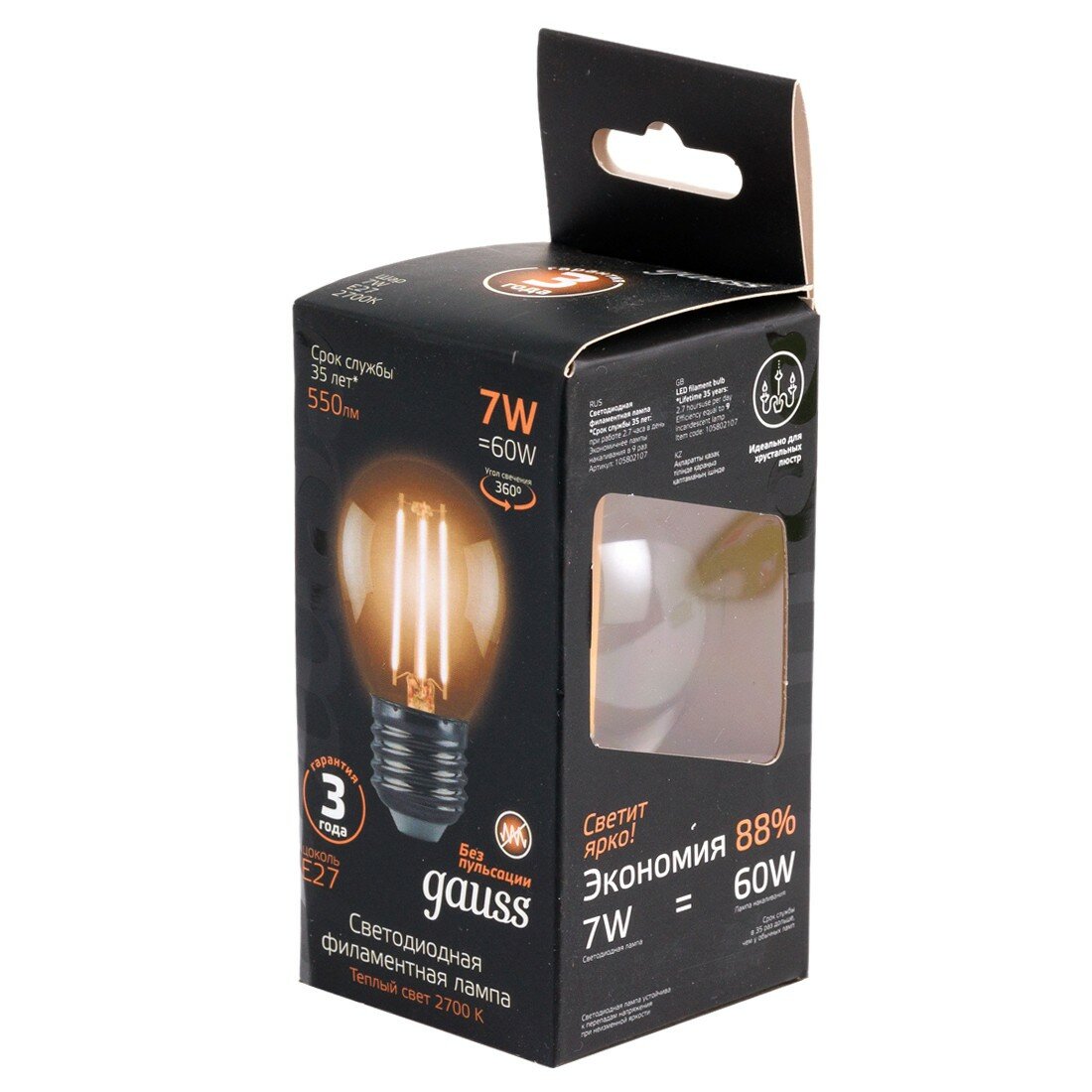СохранитьGauss Filament Шар G45 E27 7W(550lm) 2700K 2K прозр. 80x45 филамент (нитевидная), 105802107 (арт. 645945) интересное: