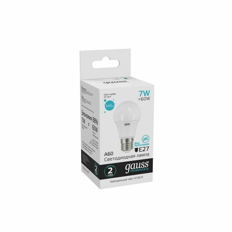(2 шт)Лампа Gauss Elementary A60 7W 540lm 4100K E27 LED