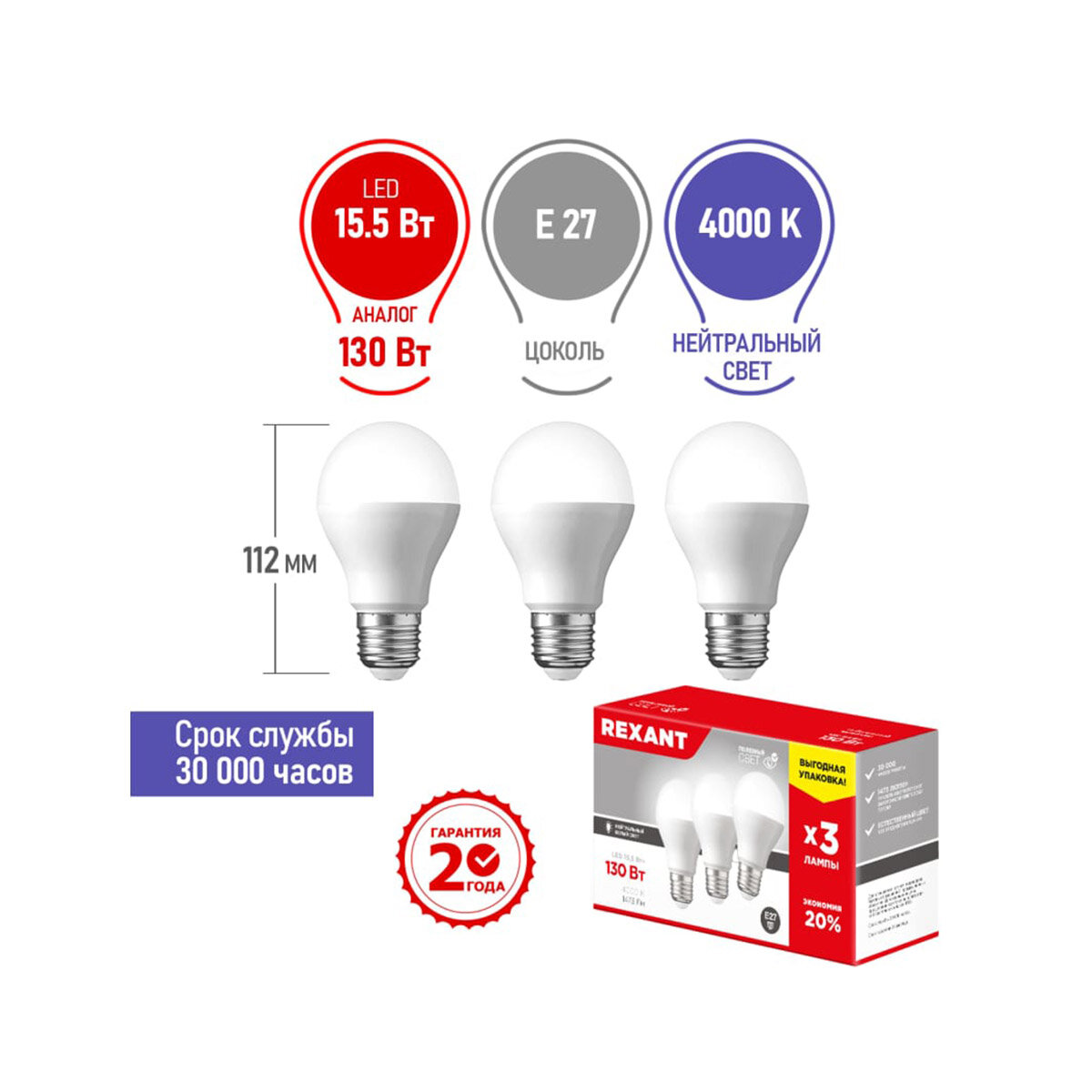 Светодиодная лампа REXANT Груша E27, 15.5 Вт, A60, 1473 Лм (=130 Вт), 4000 K (нейтральный свет), упаковка 3 шт.