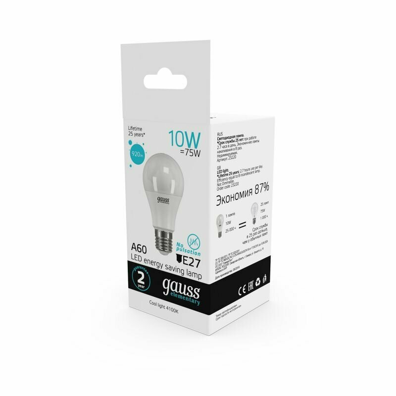 (25 шт.) Светодиодная лампочка Gauss Elementary А60 10Вт 150-265Вт 4100K E27