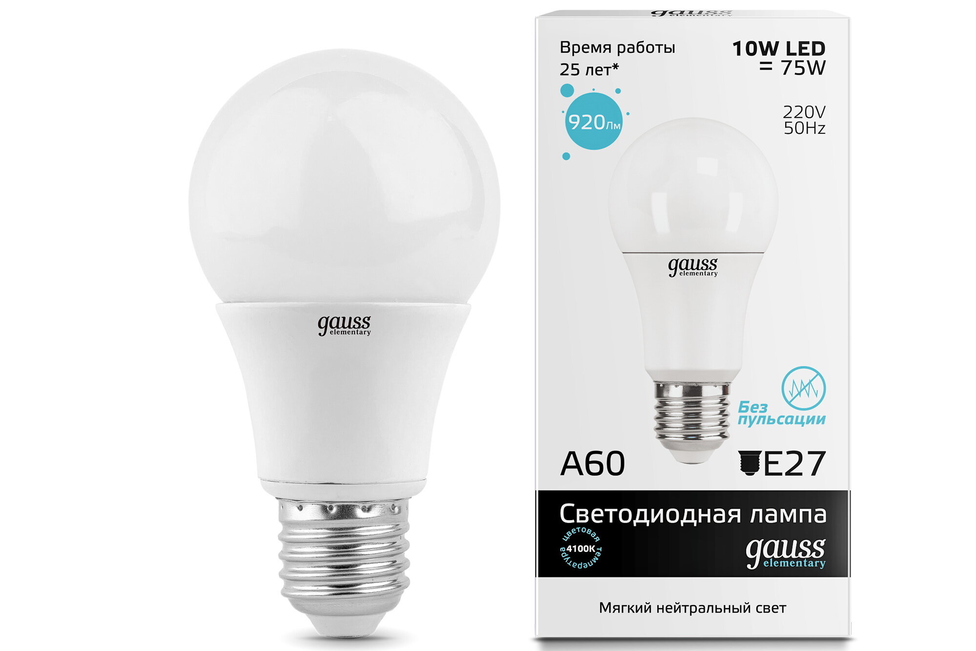 Лампа светодиодная Gauss Elementary A60 10Вт цок.:E27 груша 220B 4100K св.свеч.бел.нейт. (упак.:1шт)