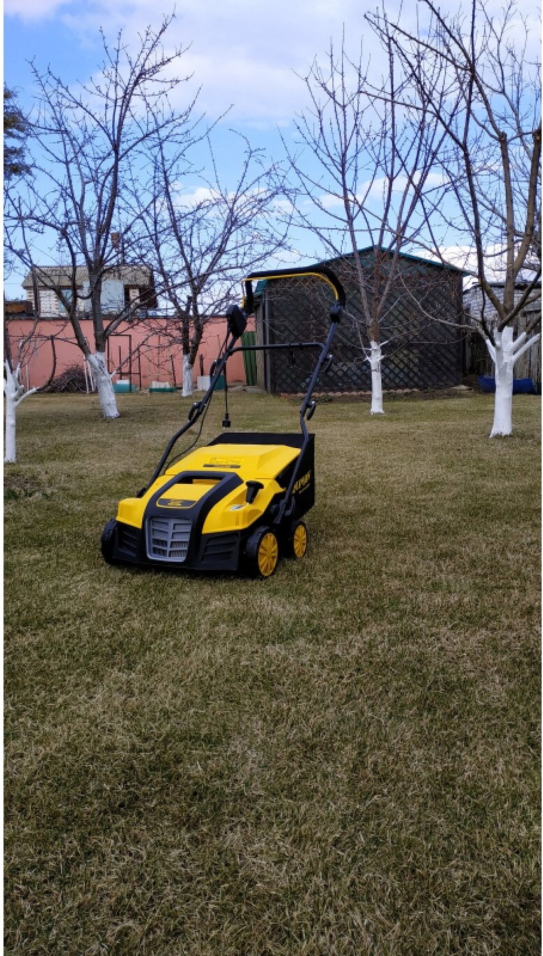 Мощный вертикуттер. Весной один раз обработали газон, затем внесли удобрения и подсеяли газонные семена. Газон отлично выглядит. |