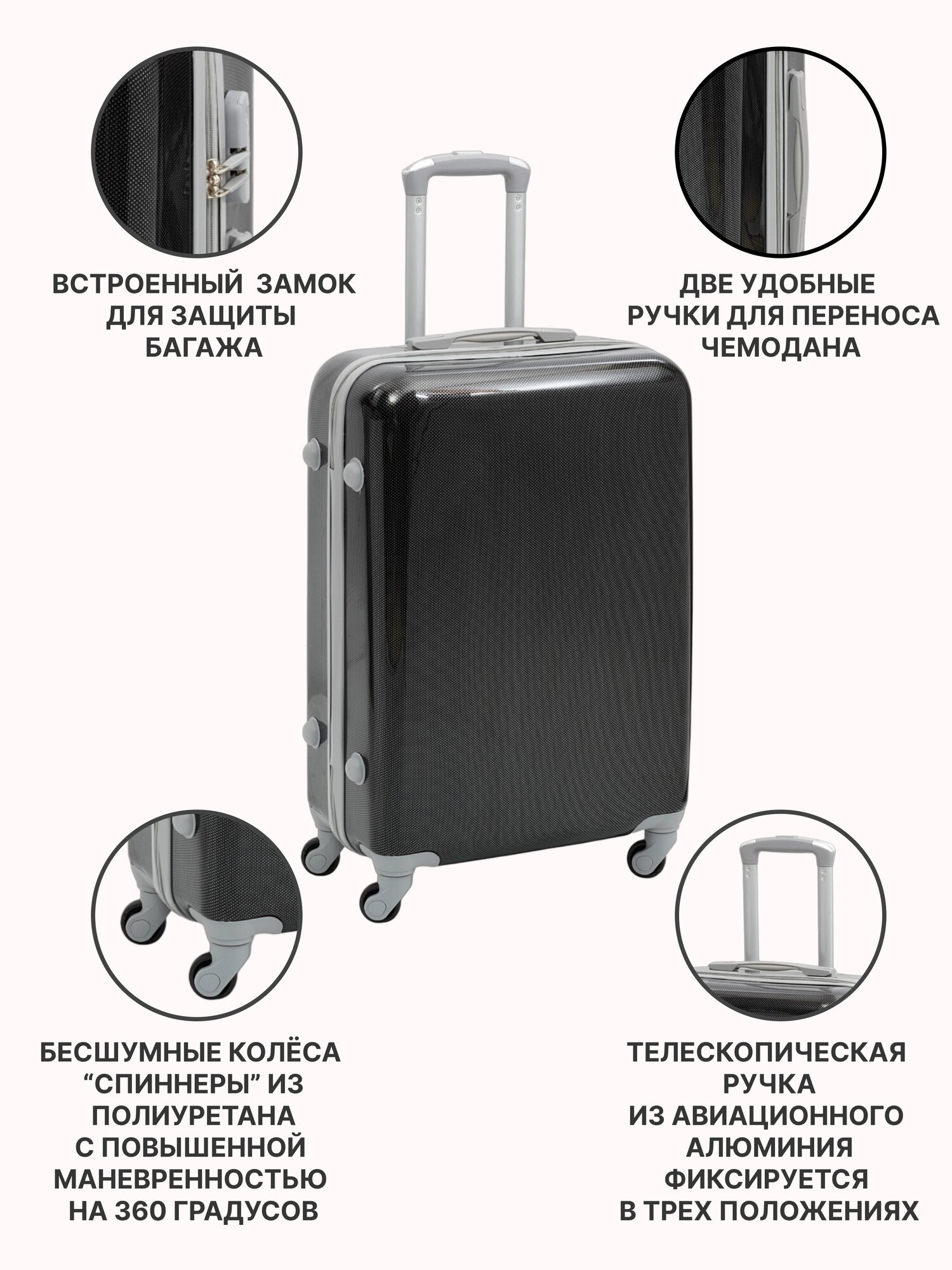 Чемодан на колесах дорожный средний багаж s+ TEVIN размер С+ 60 см 52 л легкий 2.6 кг прочный поликарбонат черный с рисунком