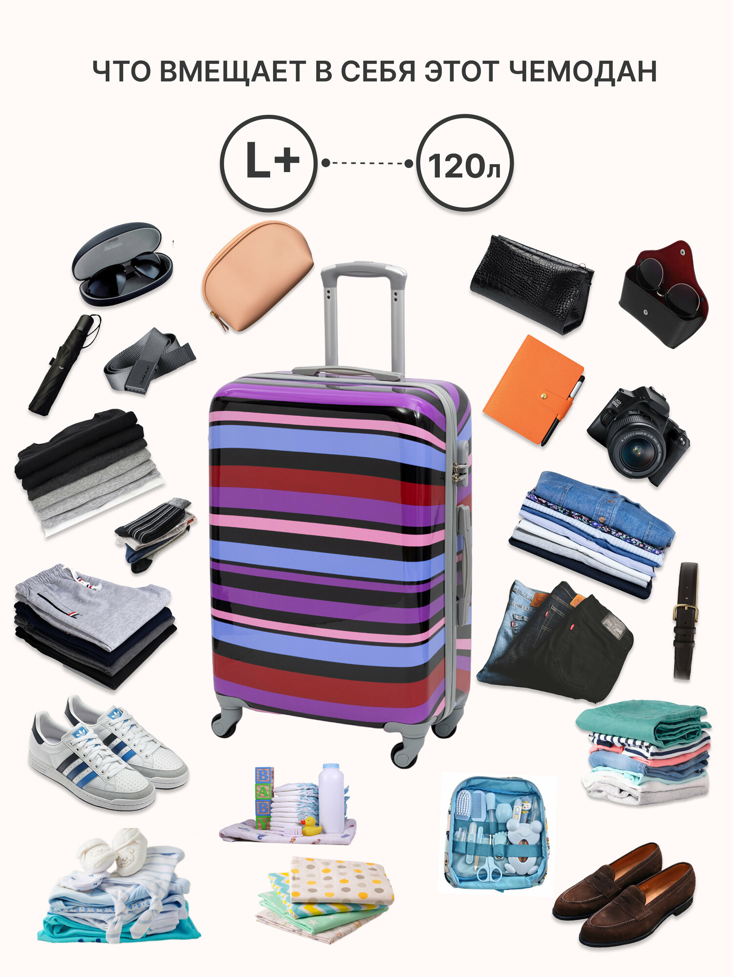 Чемодан на колесах дорожный большой семейный багаж для путешествий детский l Тевин размер Л 73 см 105 л легкий и прочный поликарбонат разрисованный