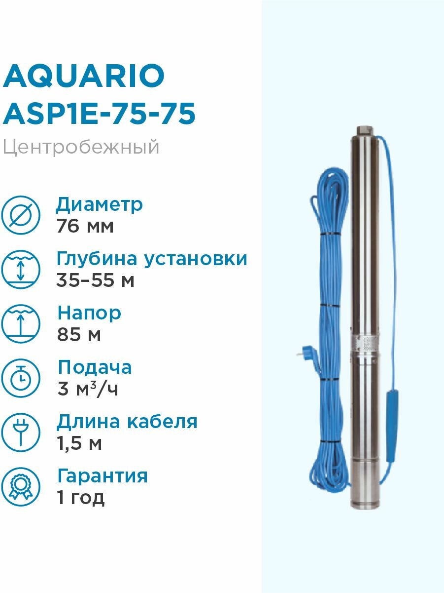 Aquario Насос погружной скважинный Aquario ASP1E-75-75 3 м3/час, 50 л/мин, Н-85 м, d-76 мм, каб. 50 м. Насос для скважин 35-55 метров центробежный акварио