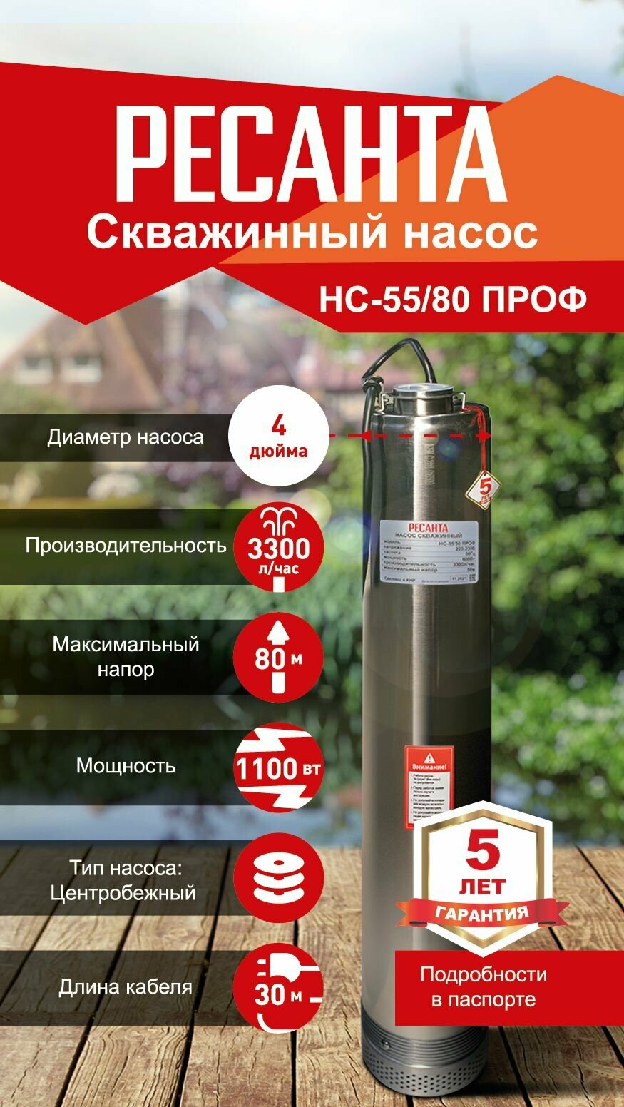 Садовый насос Ресанта НС-55/80 ПРОФ, скважинный [77/3/2]