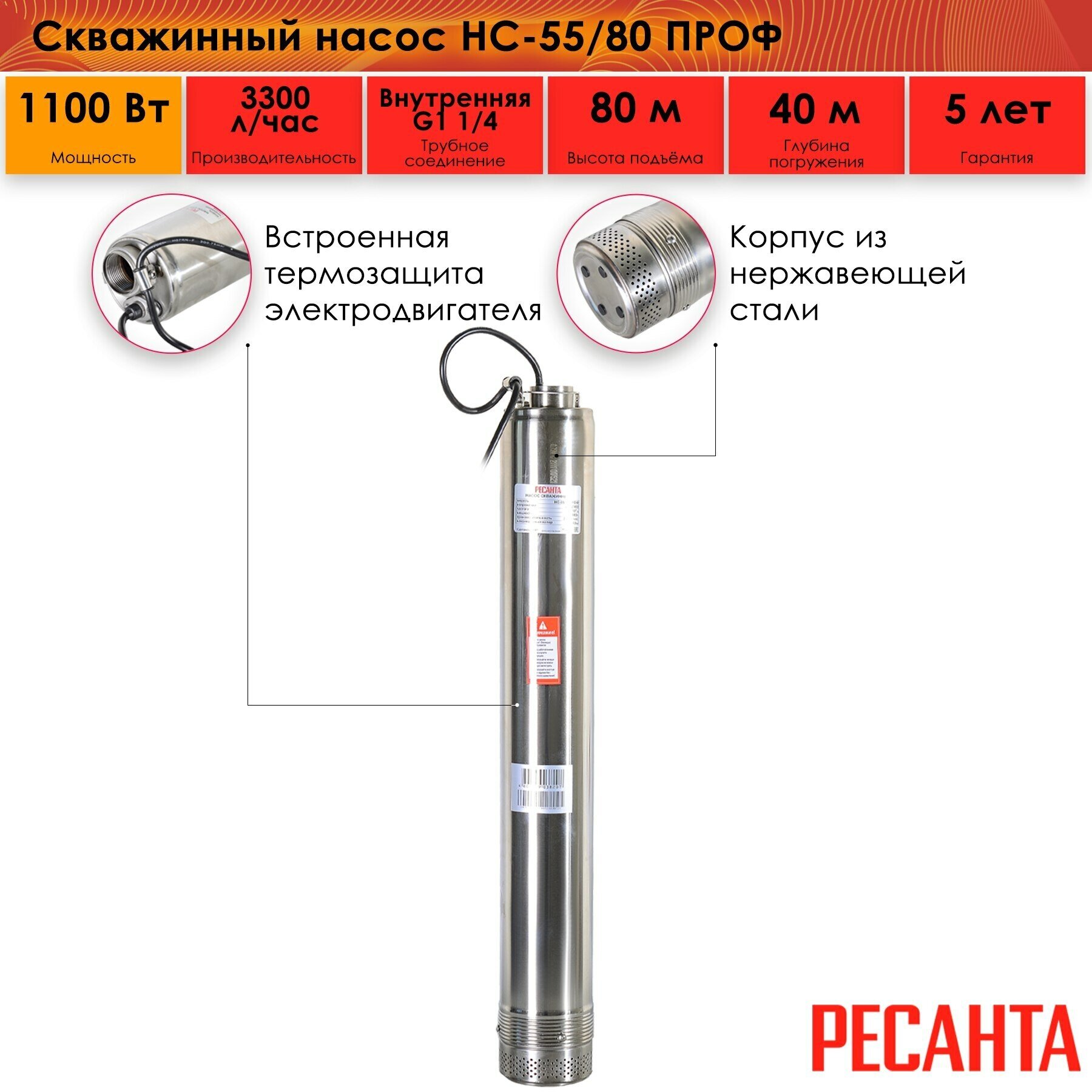 Насос / Скважинный насос Ресанта НС-55/80 ПРОФ (1100 Вт, высота подъема – 80 м, 3300 л/час, 1,25”, глубина погружения в воду до 40 м, 4”)