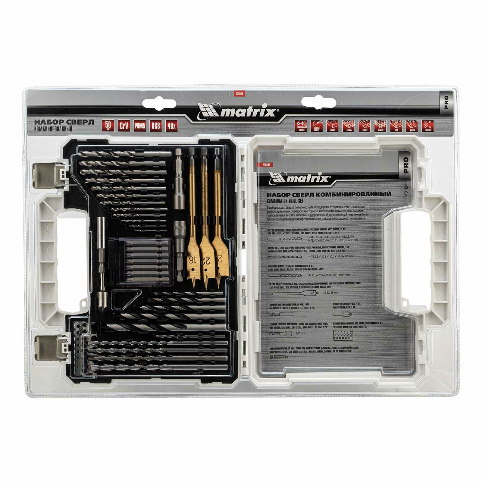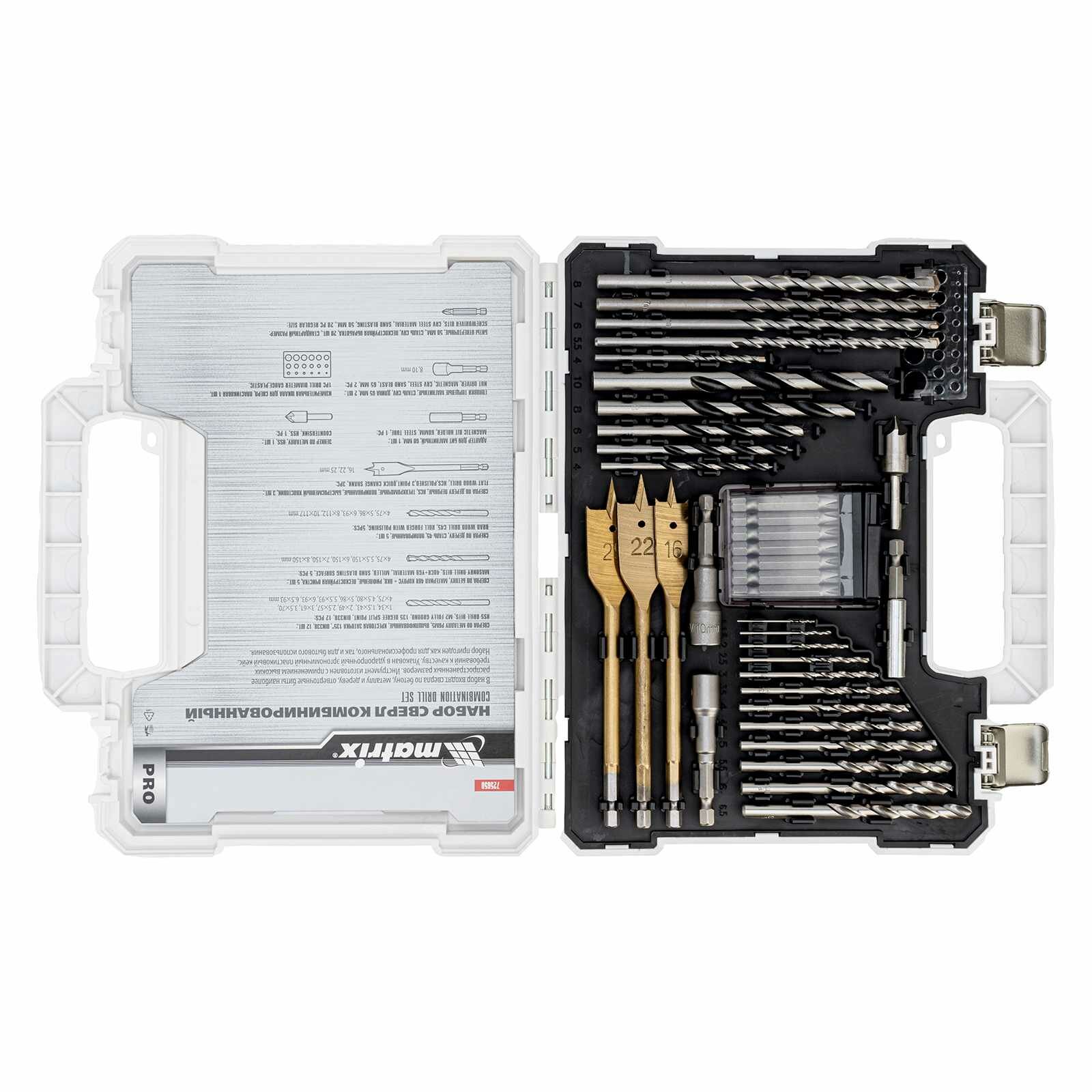 Набор сверл комбинированный, сверла по металлу 1-6.5 мм, бетону 4-8 мм, дереву 4-10 мм, перовые 16,22,25 мм, биты 20 шт, адаптер, головки 2 шт, зенковка, 50 предметов Pro Matrix, 725650
