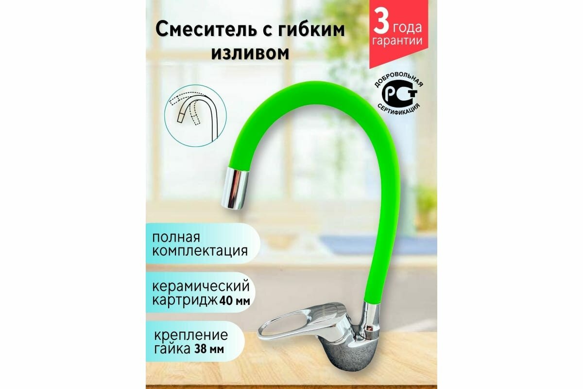 Смеситель д/кухни картридж d-35, на гайке, гибкий излив зеленый R3193F-7 RAINSBERG