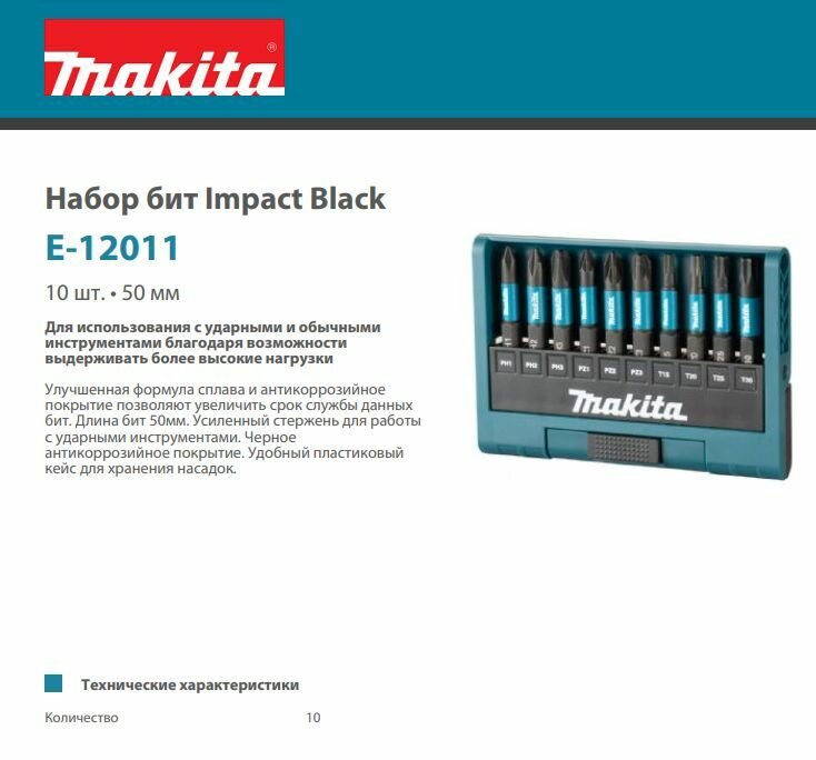 Набор бит Impact Black, 10 шт. Makita, E-12011, длина 50 мм