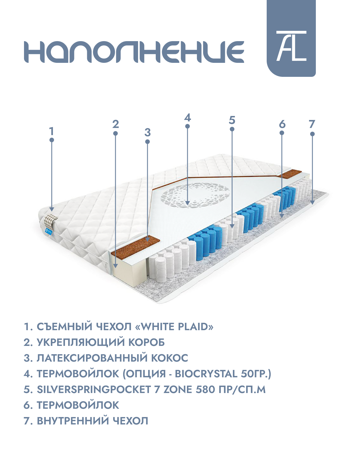 | Дополнительная информация | состав: съемный чехол «white plaid», латексированный кокос h - 1 см, термовойлок (опция - BioCrystal 50гр.), SilverSpringPocket 7 zone 580 пр/сп.м h - 14 см, термовойлок h - 0,5 см, укрепляющий короб, внутренний чехол |