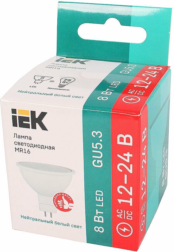 Лампа LED MR16 софит 8Вт 12-24В 4000К GU5,3, IEK LLE-MR16-08-12-24-40-GU5 (1 шт.)