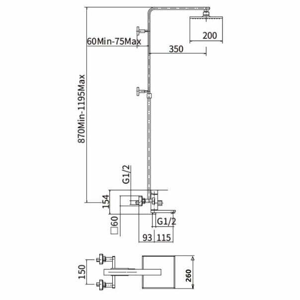 | Дополнительная информация | верхняя лейка: чёрная ABS, квадратная 200х200 мм; ручная лейка: чёрная ABS 115х85 мм, 2 режима; форма бокового душа: прямоугольная |