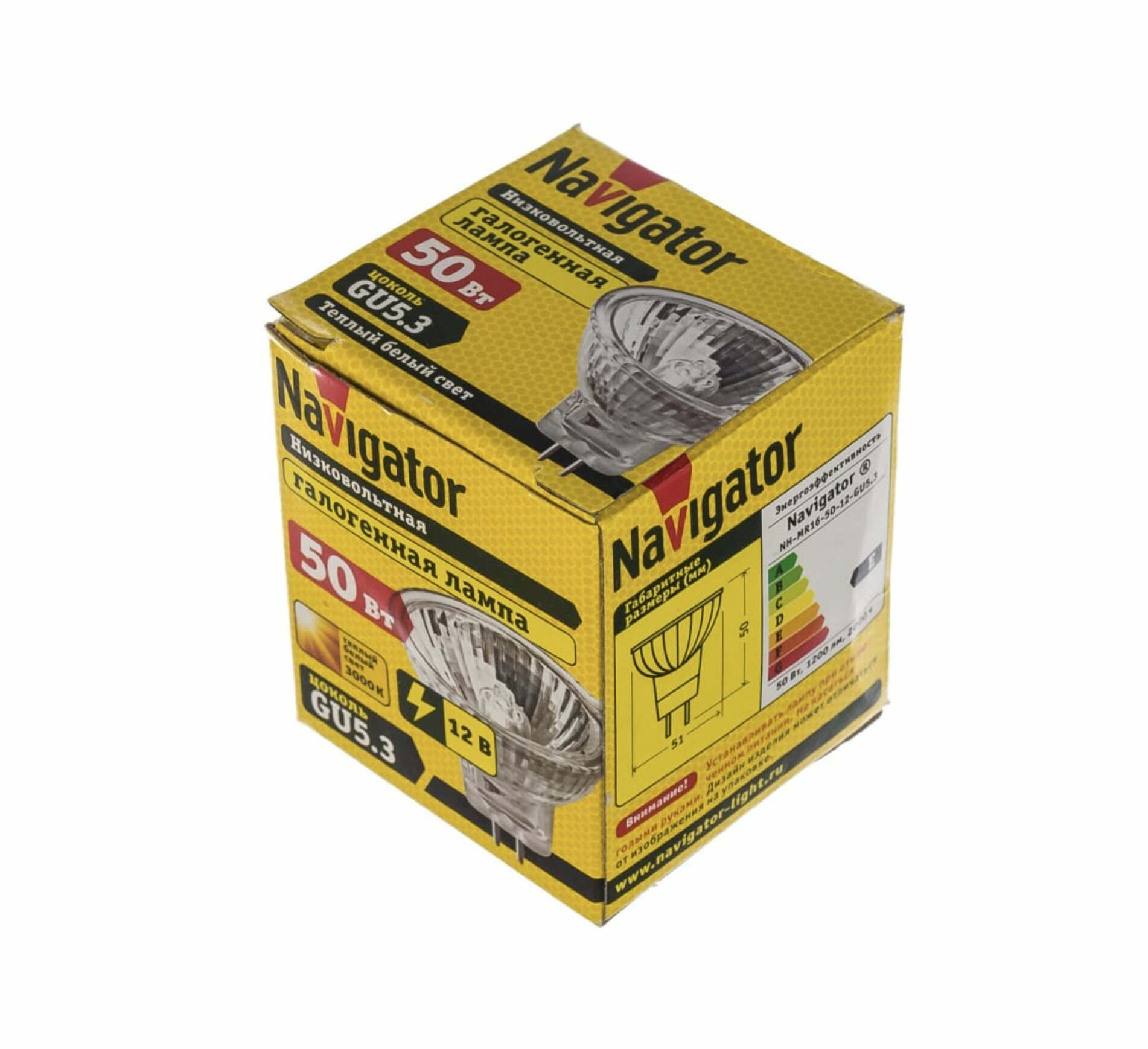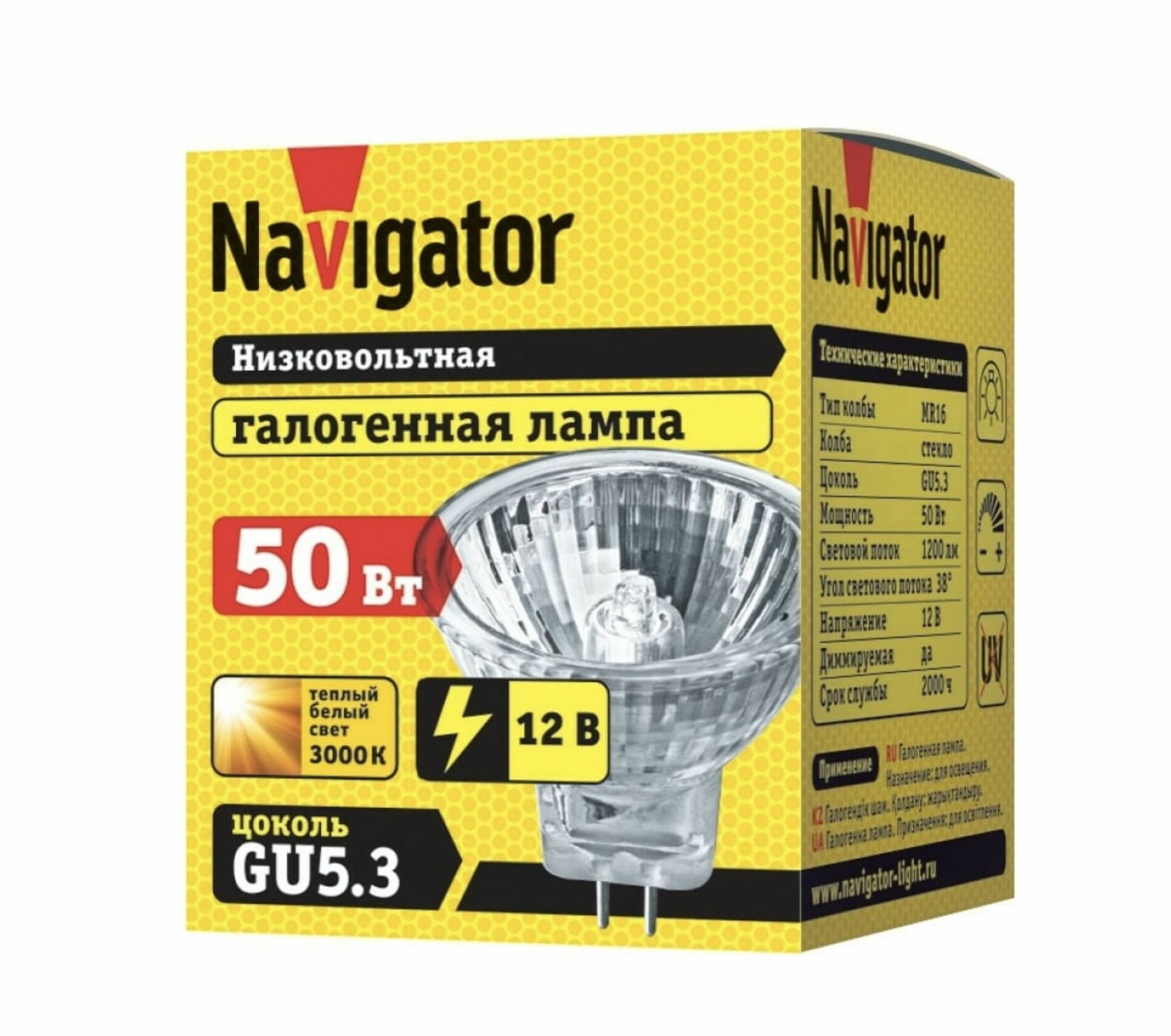 (12 шт.) Низковольтная галогенная лампочка Navigator MR16, мощность 50 Вт, напряжение питания 12 В, цветовая температура 3000 К, теплый белый свет, цоколь GU5.3, диммируемая, размер 51х50 мм