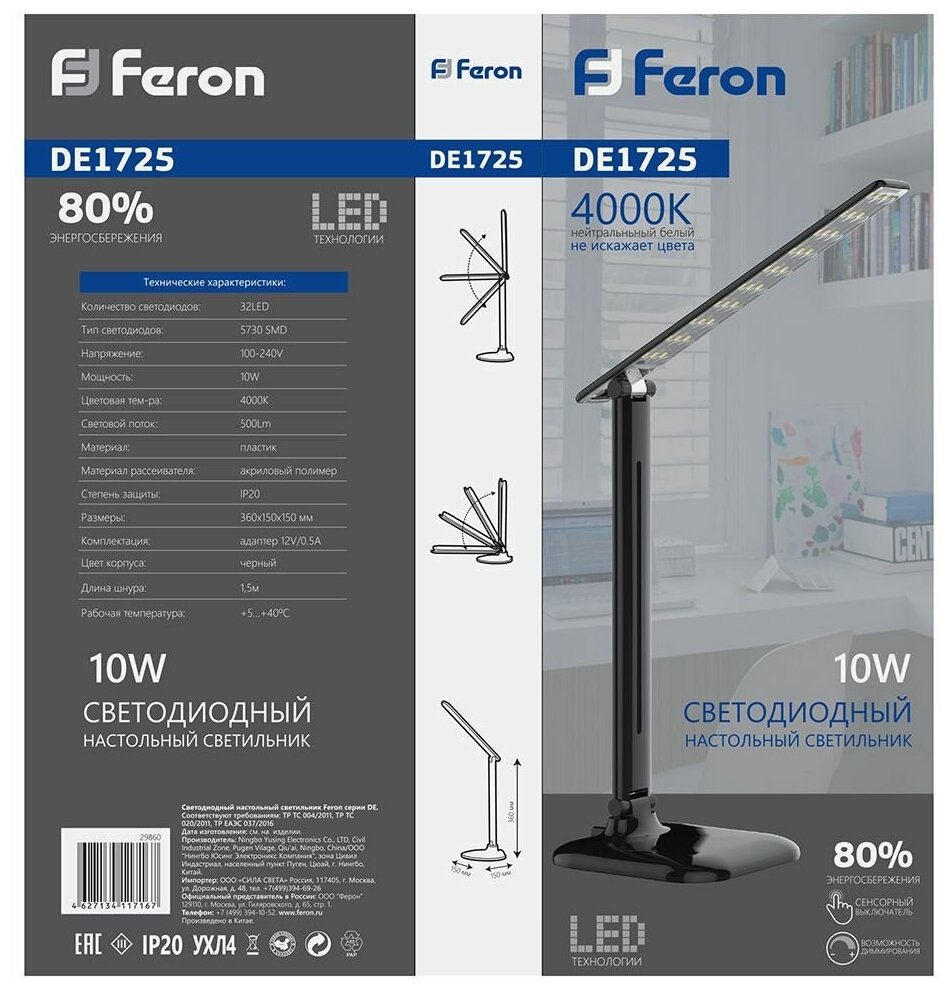 Светильник настольный складной 10W, 4000K, 100-240V, черный, DE1725, Feron, 29860