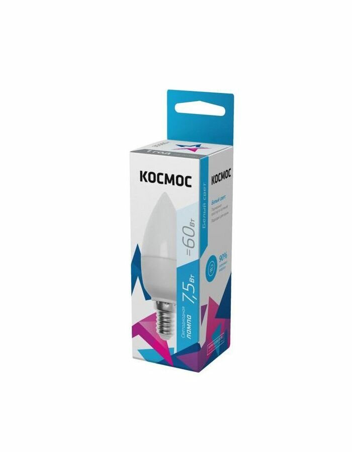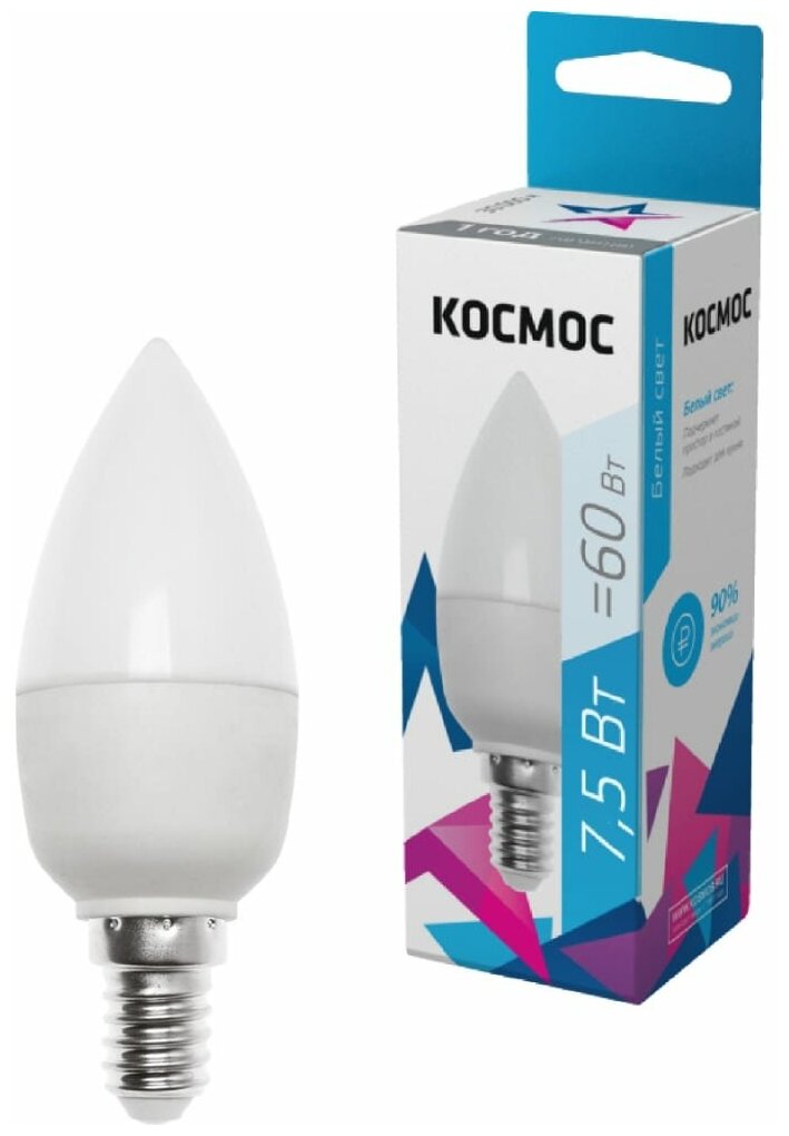 Лампочки светодиодные Космос Свечка 7,5Вт Е14 (аналог 60Вт) Нейтральный белый свет, 1 шт.