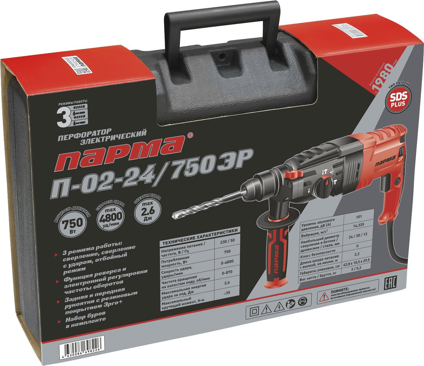 Перфоратор парма П-02-24/750ЭР [02.027.00005] { 750Вт,3-х реж,2,6Дж, SDS-plus, рег.об.,рев,пл.пуск, рук.Эрго+)(5ш/к) }