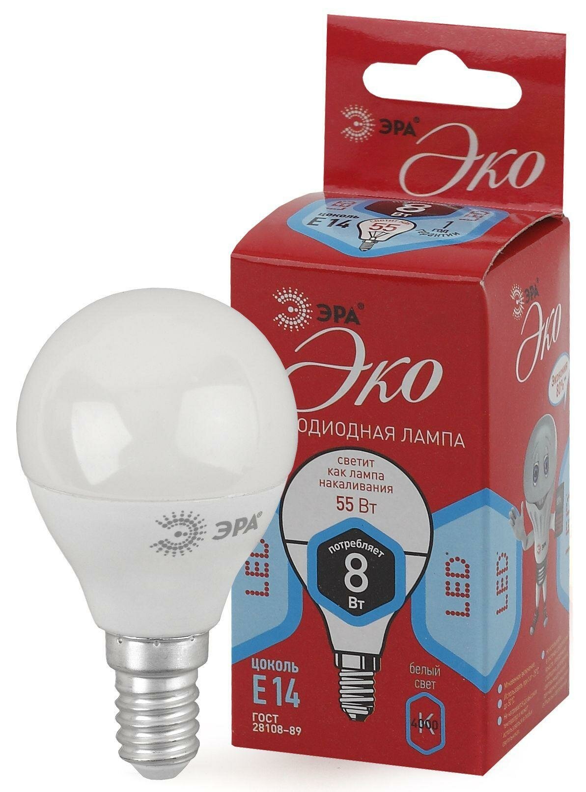 Светодиодная LED лампа шар ЭРА ECO шар P45 E14 8W(640lm) 4000K 4K P45-8w-840-E14 Б0030023 интересное: