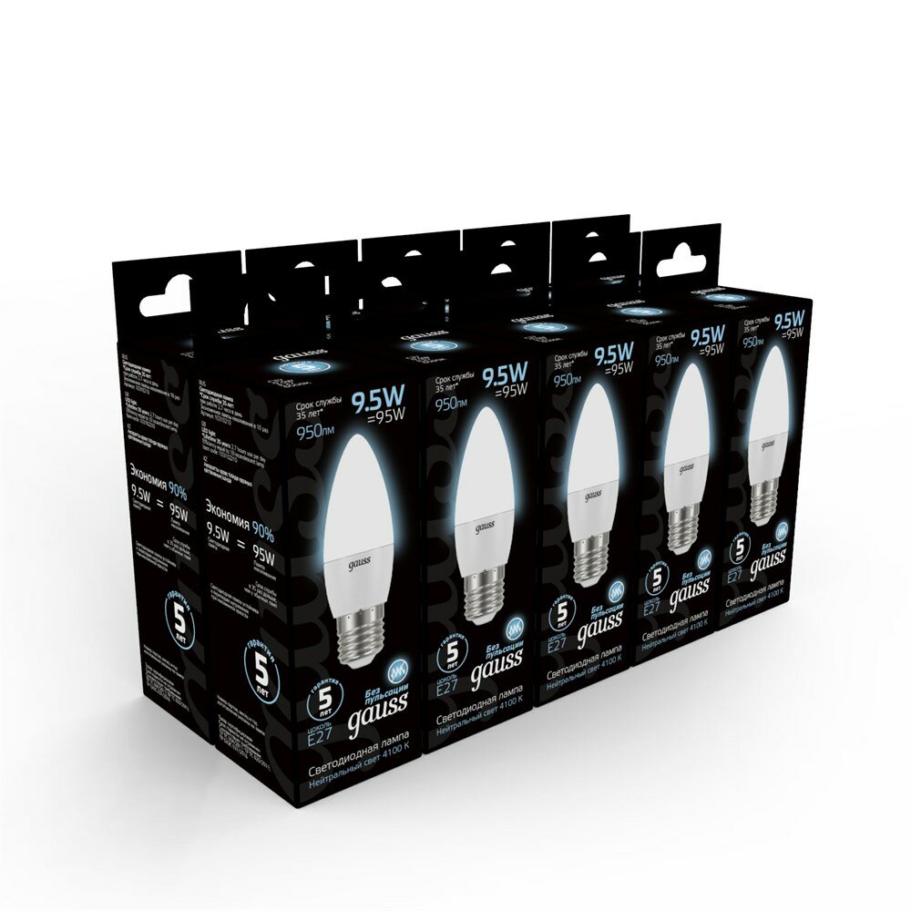 (5 шт.) Светодиодная лампочка Gauss Свеча C37 E27 9.5W(950lm) 4100K 4K 101x37матовая, алюм./пластик 103102210