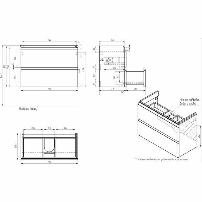 Тумба под раковину аквакрафт Violetta 90 для ванной комнаты, подвесная, графит.