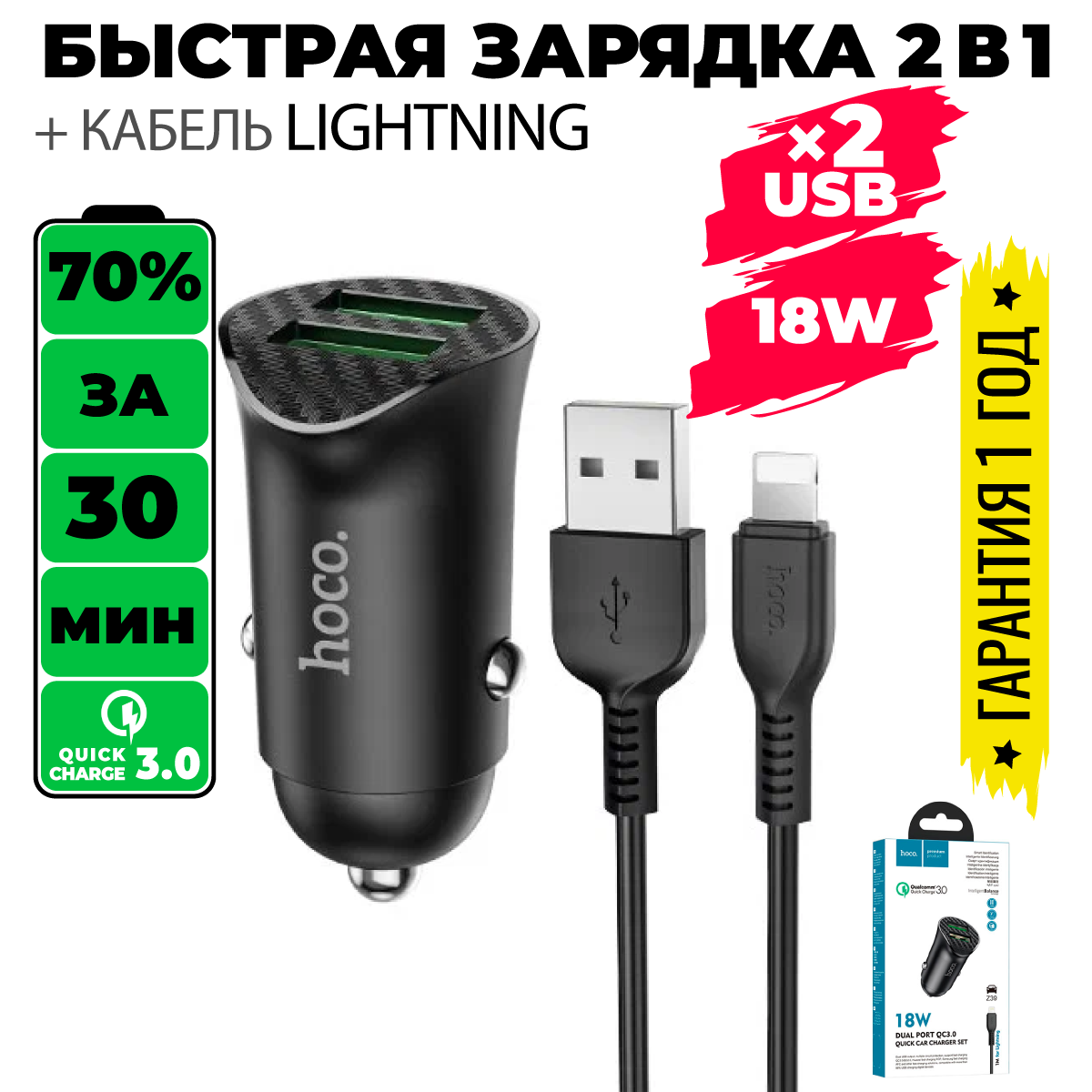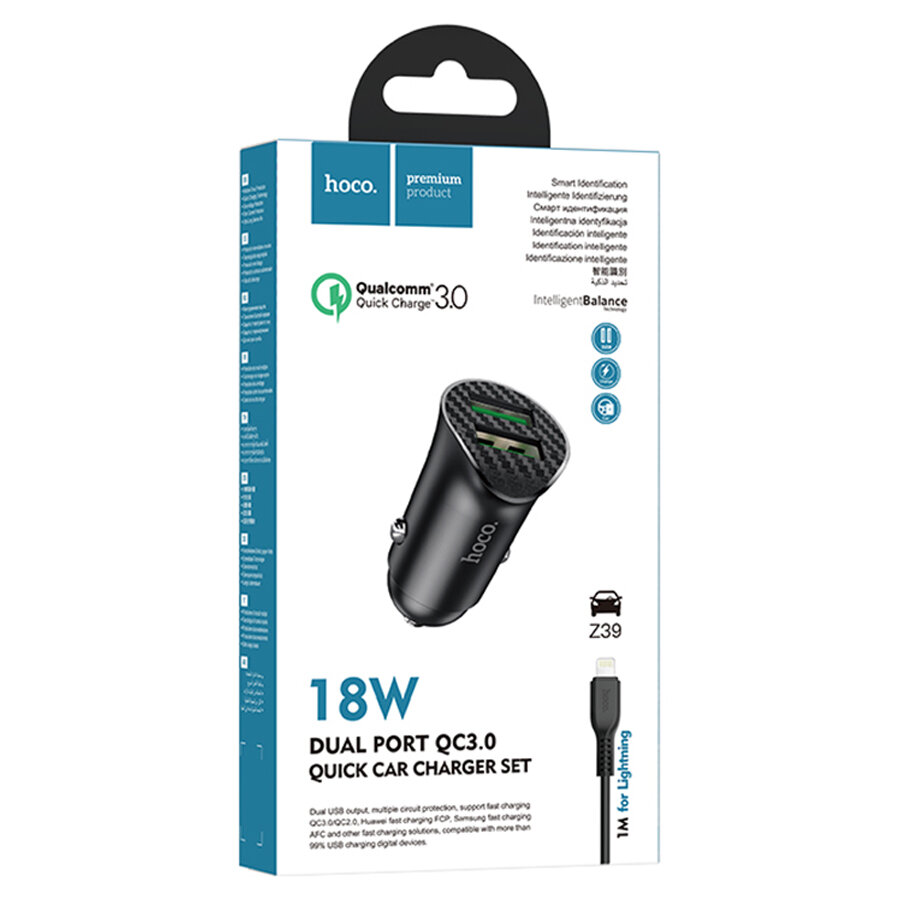 Автомобильное зарядное устройство, 2 USB 3.0 QC (Z39), 18W, HOCO, кабель lightning, черный