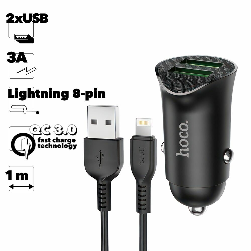 Автомобильное зарядное устройство Hoco Z39 Farsighted 2xUSB, QC 3.0, 18Вт + кабель Lightning 8-pin, черный